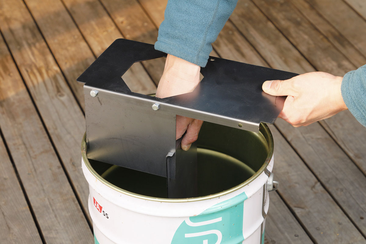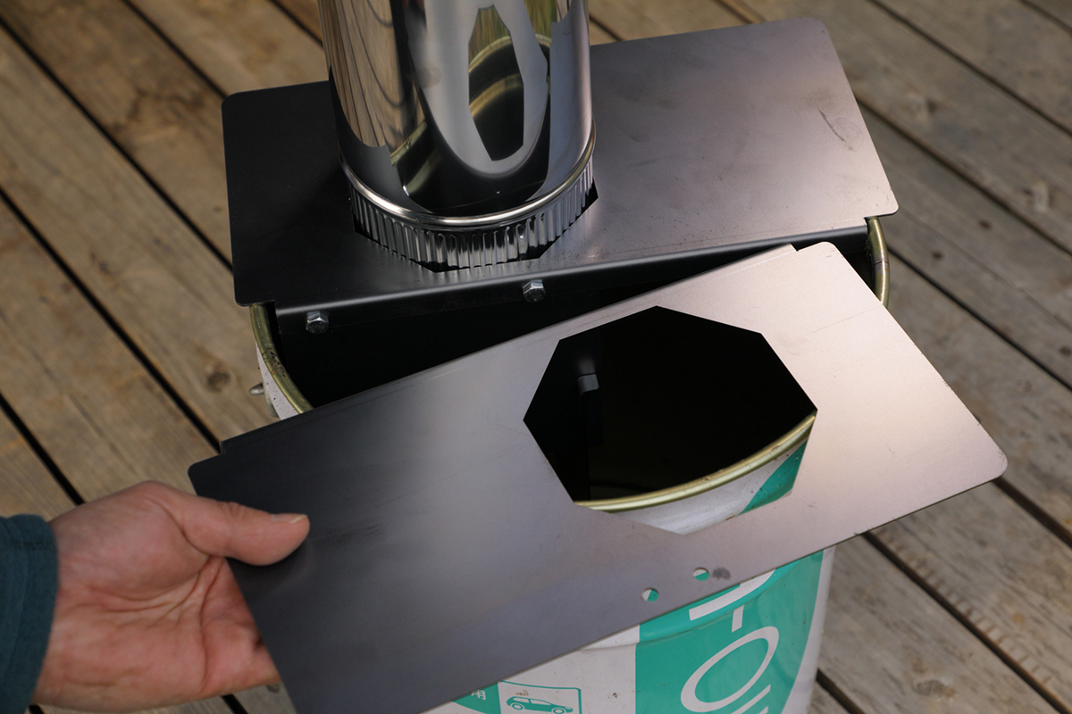 各部が安定しているのを確認したら、ペール缶の上にもう1枚の天板を置き、煙突の先端にゴトク用の十字状のプレートを装着すれば本体の完成! 包みを開封してから、ここまで30分弱という早業。多分、誰もが間違いなく作れるはずです!