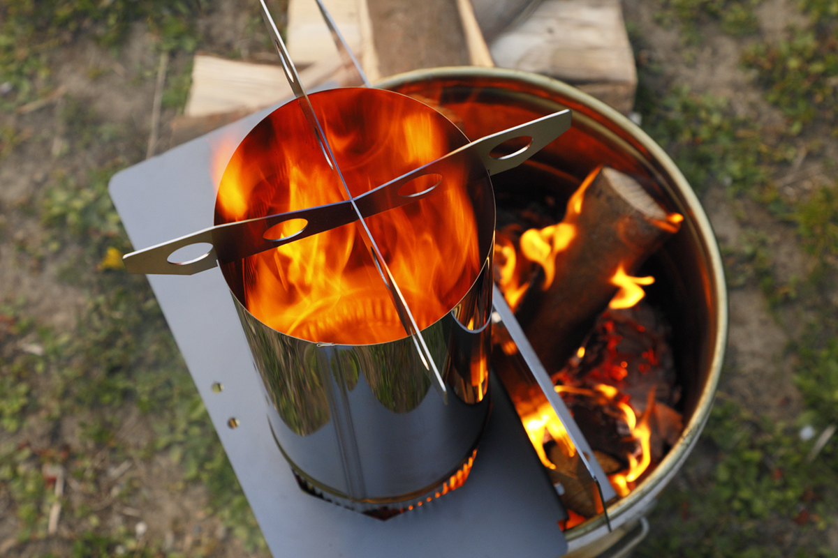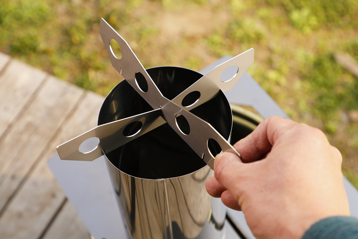 ゴトクを置いた煙突先端が最大火力コンロとなるのが、このストーブの面白いところ。ここからロケットエンジンのように炎が吹き出すというから楽しみです。