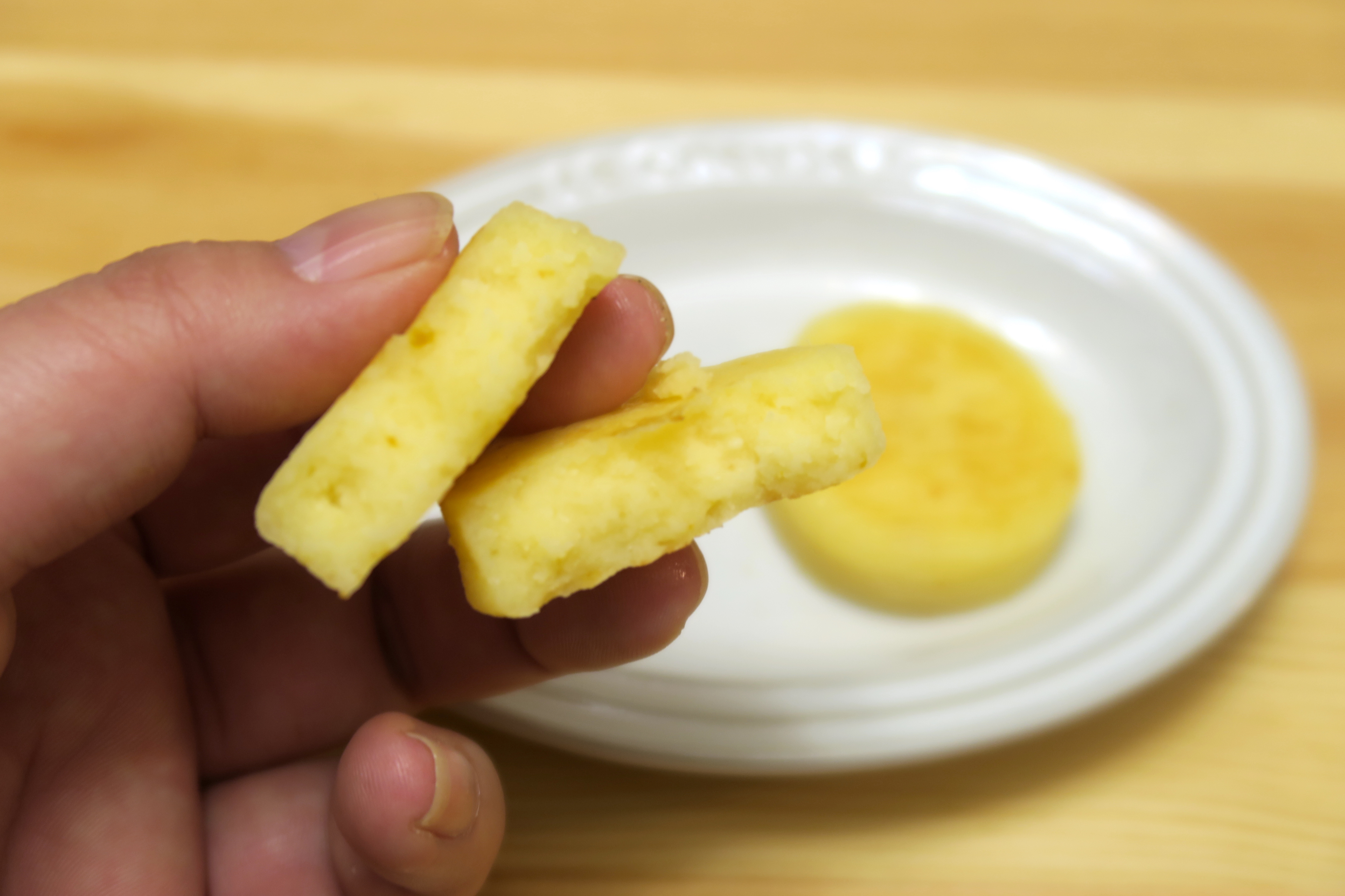 九州産のさつまいもを使用したこの大学いもは、自然解凍で食べます。ちょっとひんやり冷たいかなというときに食べると、飴のカリッとした食感が楽しめるのでおすすめ。珍しさはないぶん、「いつものおやつ」という安心感があります。あと、さつまいもを丸ごと食べているような感じなので、おやつを食べる罪悪感がちょっと軽減されるかもしれません。