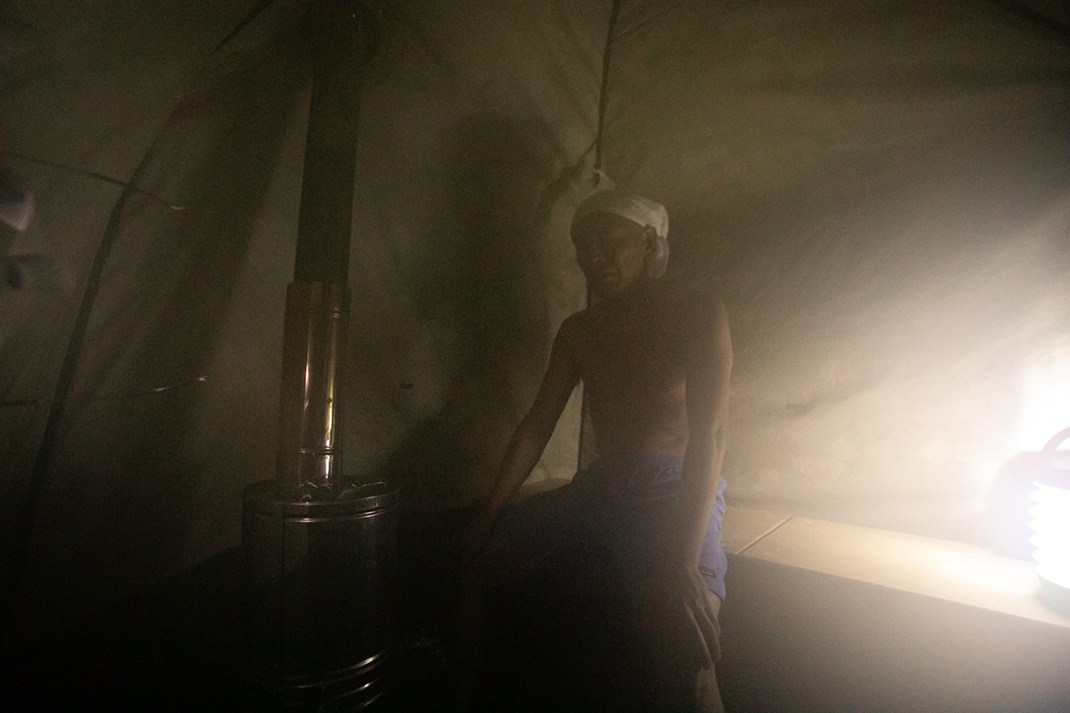 火が安定すると徐々に蒸気がテント内に充満し、いよいよサウナタイムです。