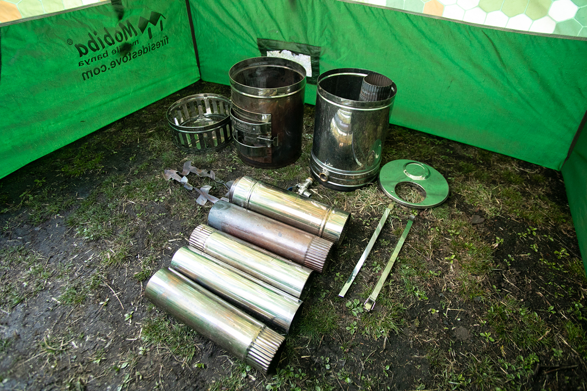 まずは構成パーツ(ストーブ、タンク、タンクカバー、ベース、バンド2本、保護スクリーン、蒸気加熱器、Φ90mm煙突1本、テーパー煙突3本、Φ75mm煙突1本、フィン2本、蛇口、パッキン2枚)をテント内に広げます。