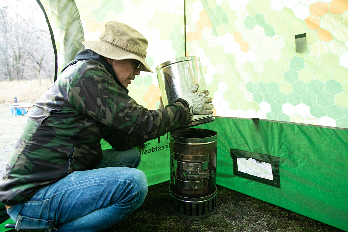 そしていよいよ着火! 焚き付けを入れ、細い針葉樹から入れて炎が上がったら、広葉樹を投入し、火力を安定させます。