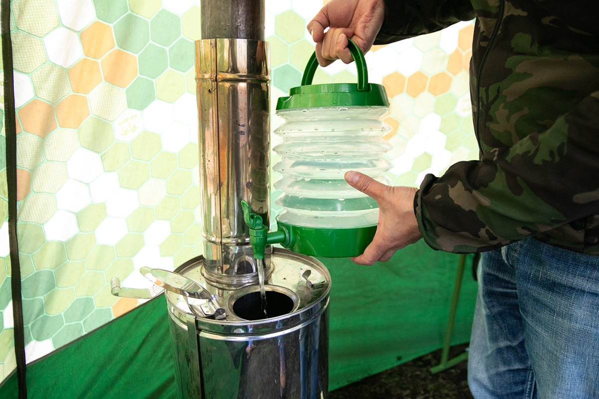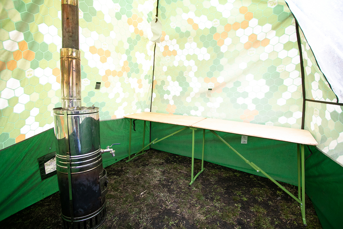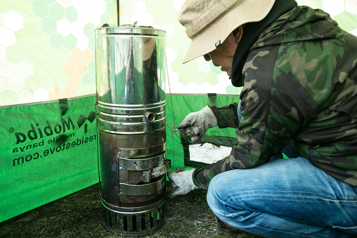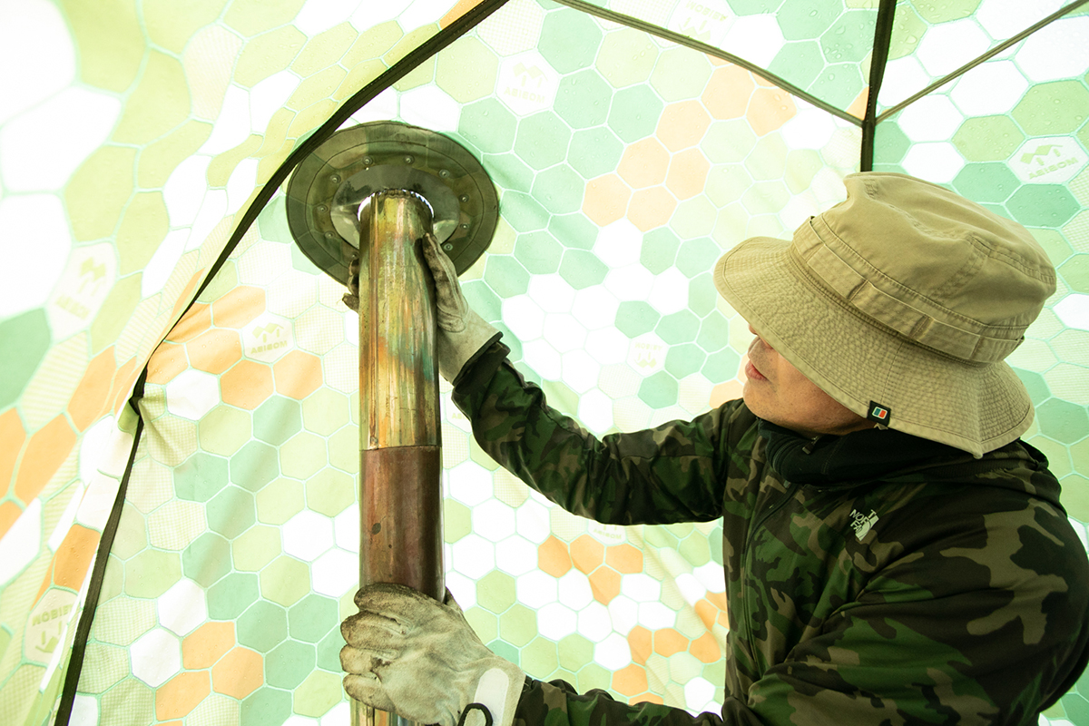 テントにストーブが当たって溶けないよう、ストーブとテントの間を30cm以上、蒸気加熱器とテントとの間を20cm以上空けましょう!