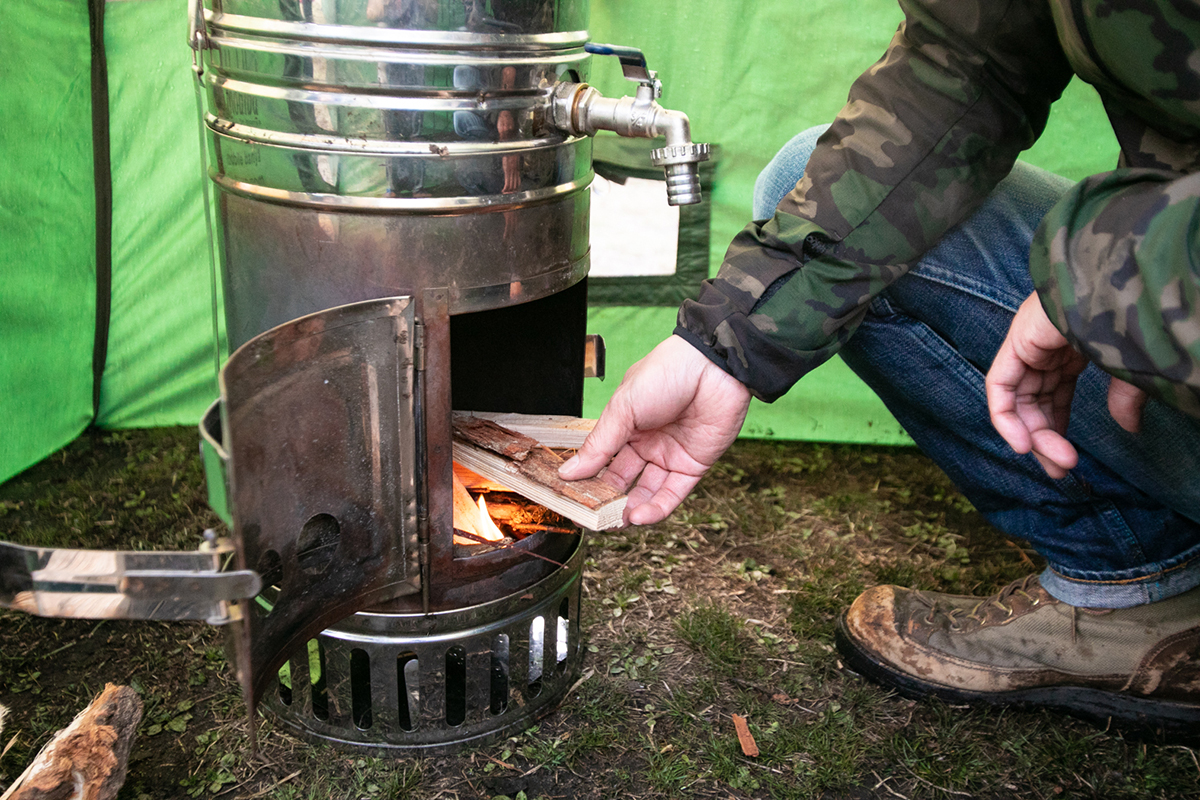 ■タンクに水を入れて、薪を燃やしていざ!