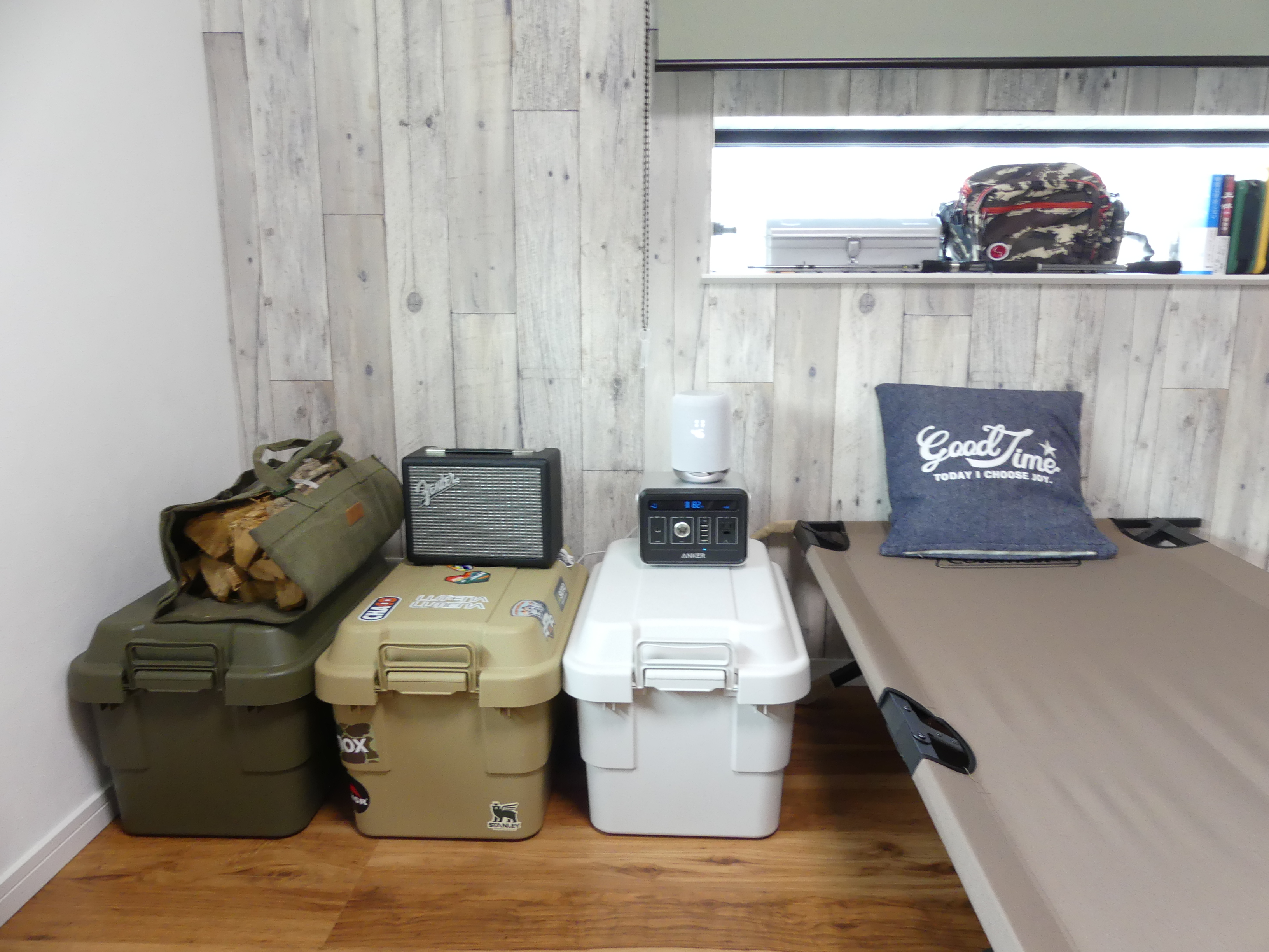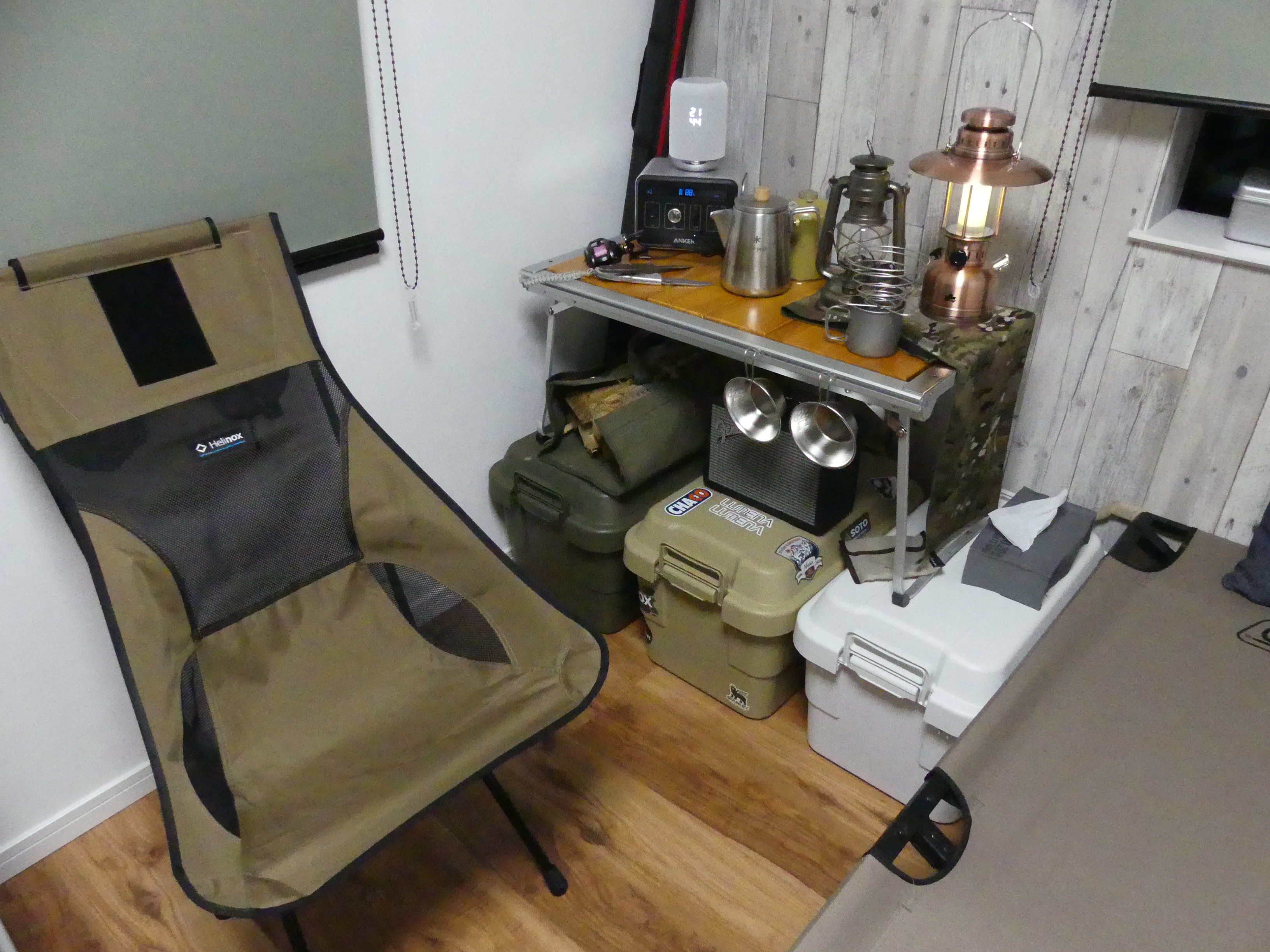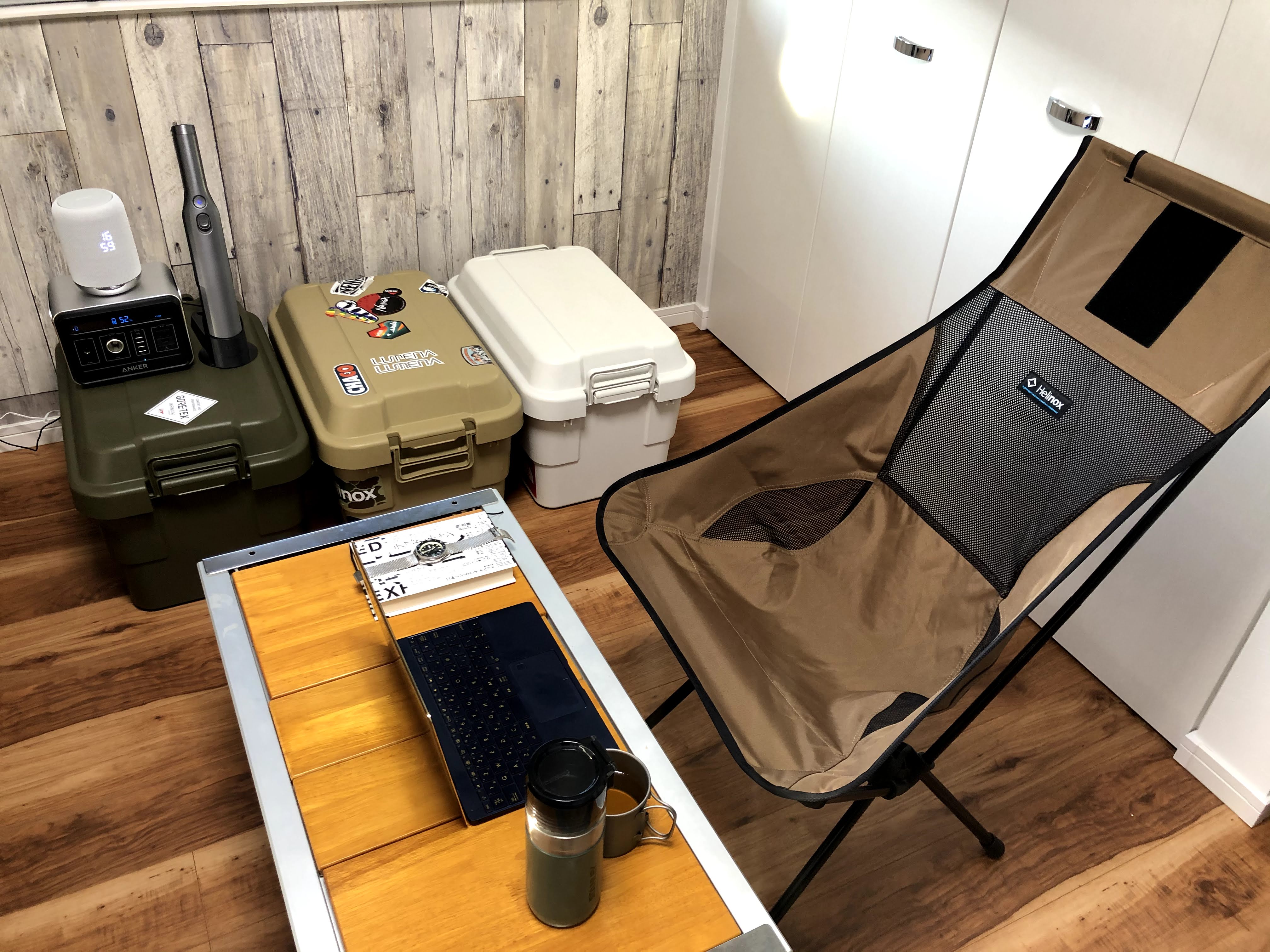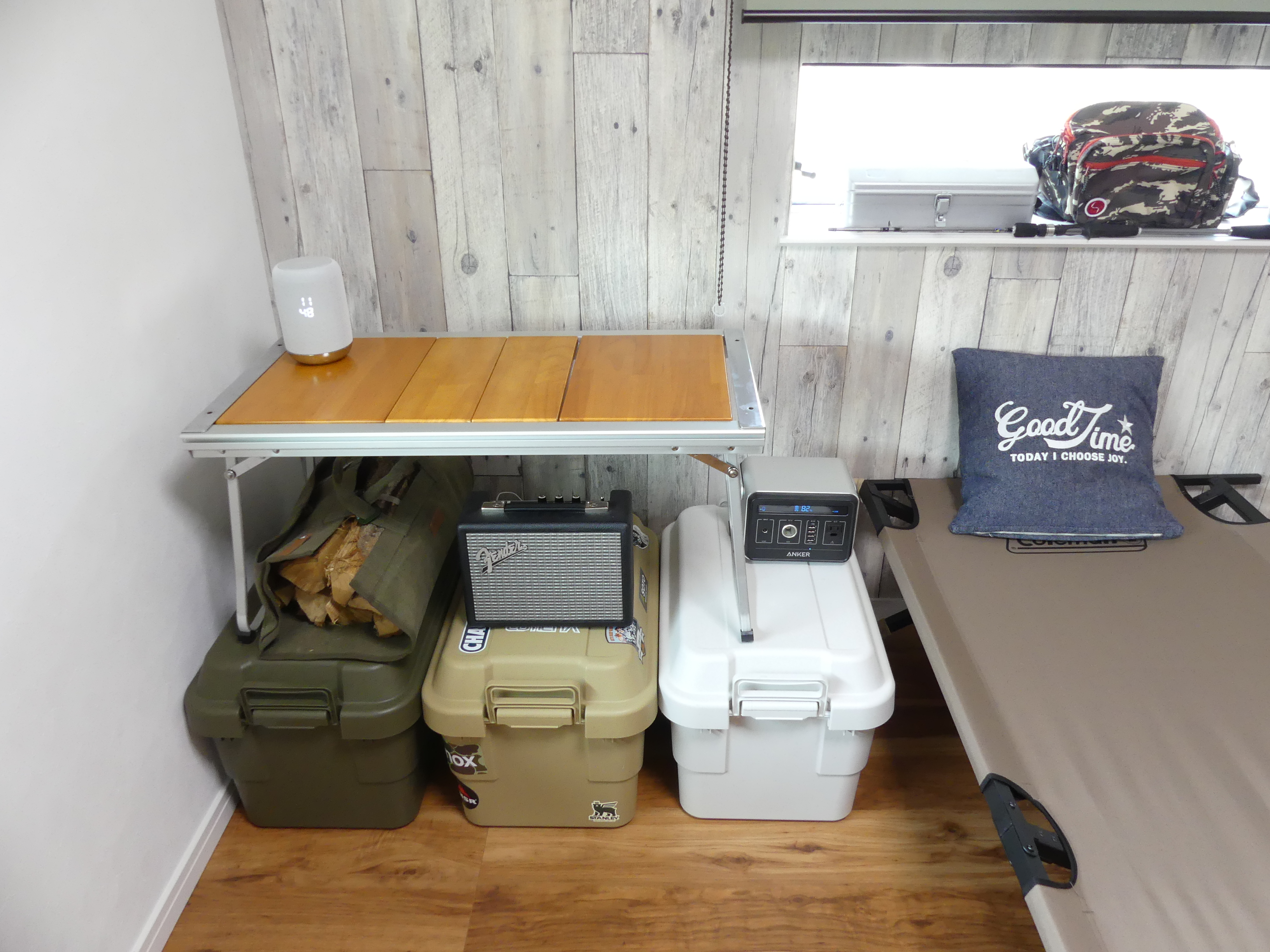 少し高さが出たので部屋が立体的になってきました。この前にチェアを置けば作業台として使えるじゃない、と思いセッティング。なんかしっくりきた! そうだワイヤレススピーカーやポータブル電源で遊びやすくして、アウトドアギアのメンテナンスとか、ここでやればいいんだと思いまして。一気に散らかしてみることに。