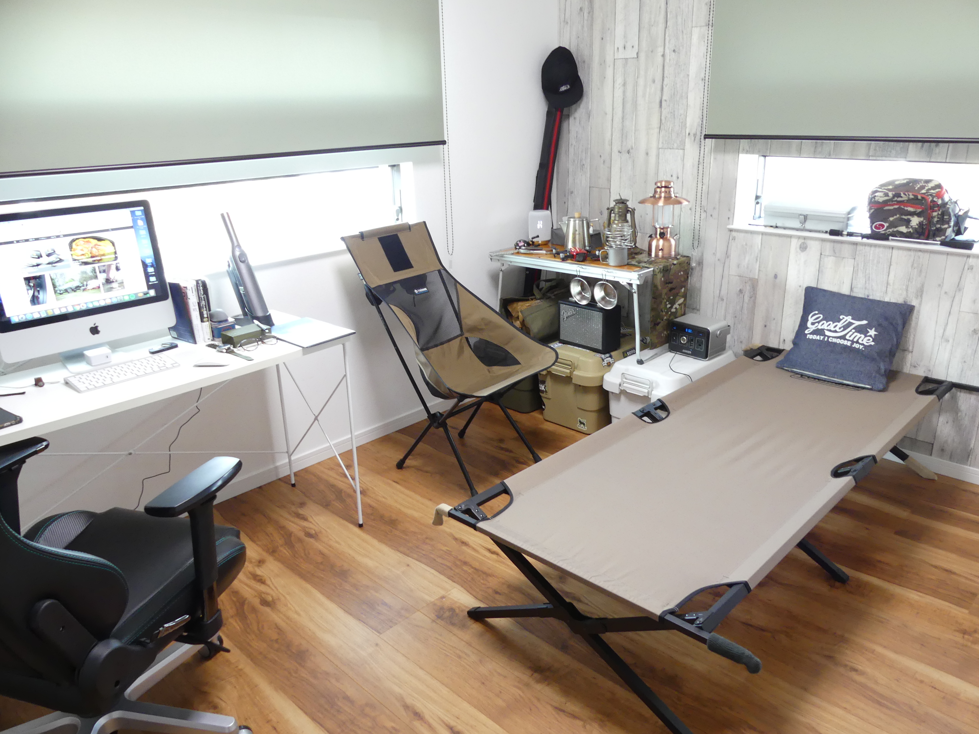 うん、想像通り。仕事場に使いやすくて心地いいアウトドアっぽさが出ました。ナイフやランタン、釣り具の手入れだけでなく、気分転換に読書やコーヒーを淹れてひと休みも可能。コットで仮眠もできて言うことなしです。