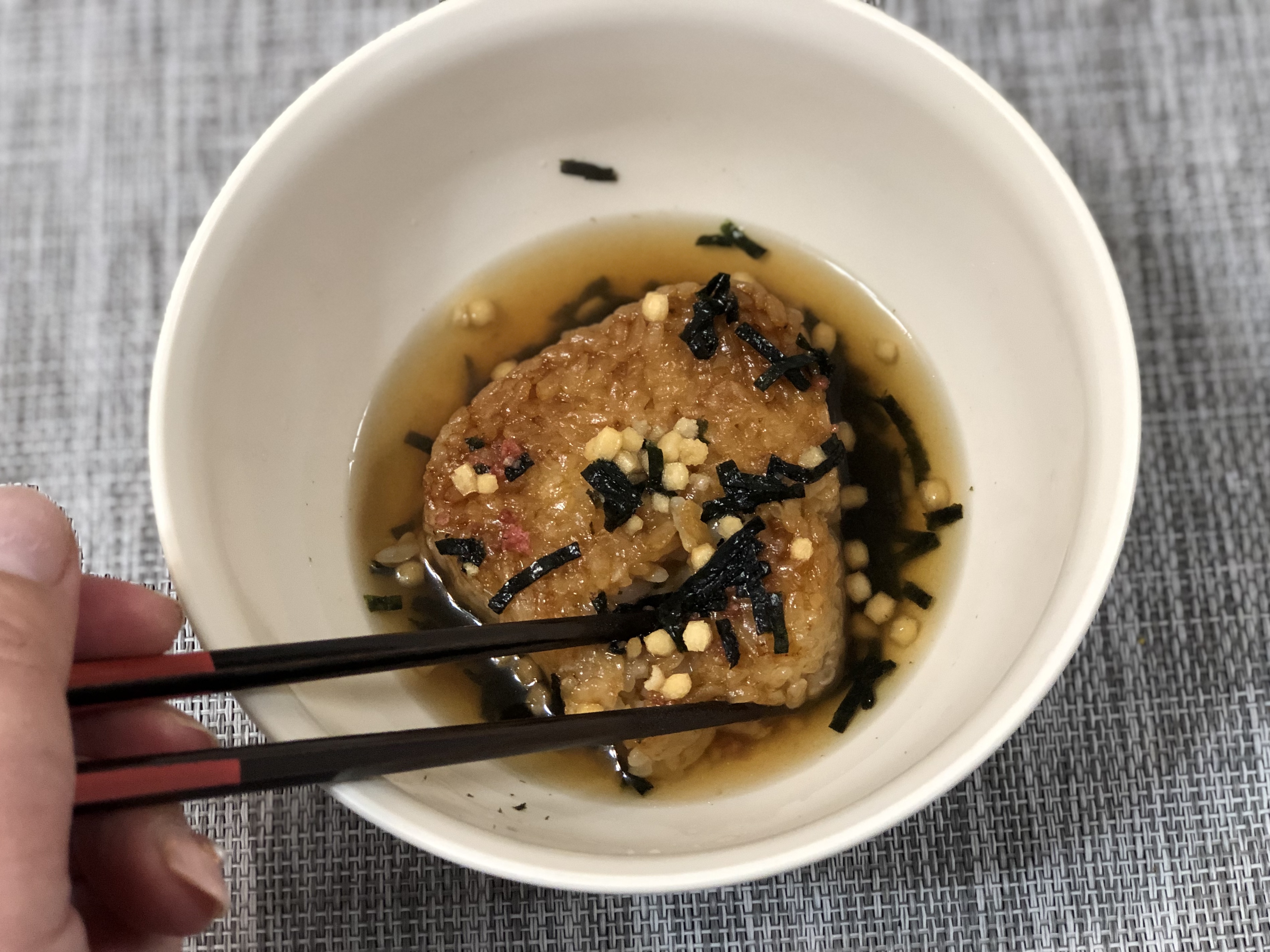 ▲ニッスイの「大きな大きな焼きおにぎり」は、アメットで焼いたあと、だし茶漬けにしました