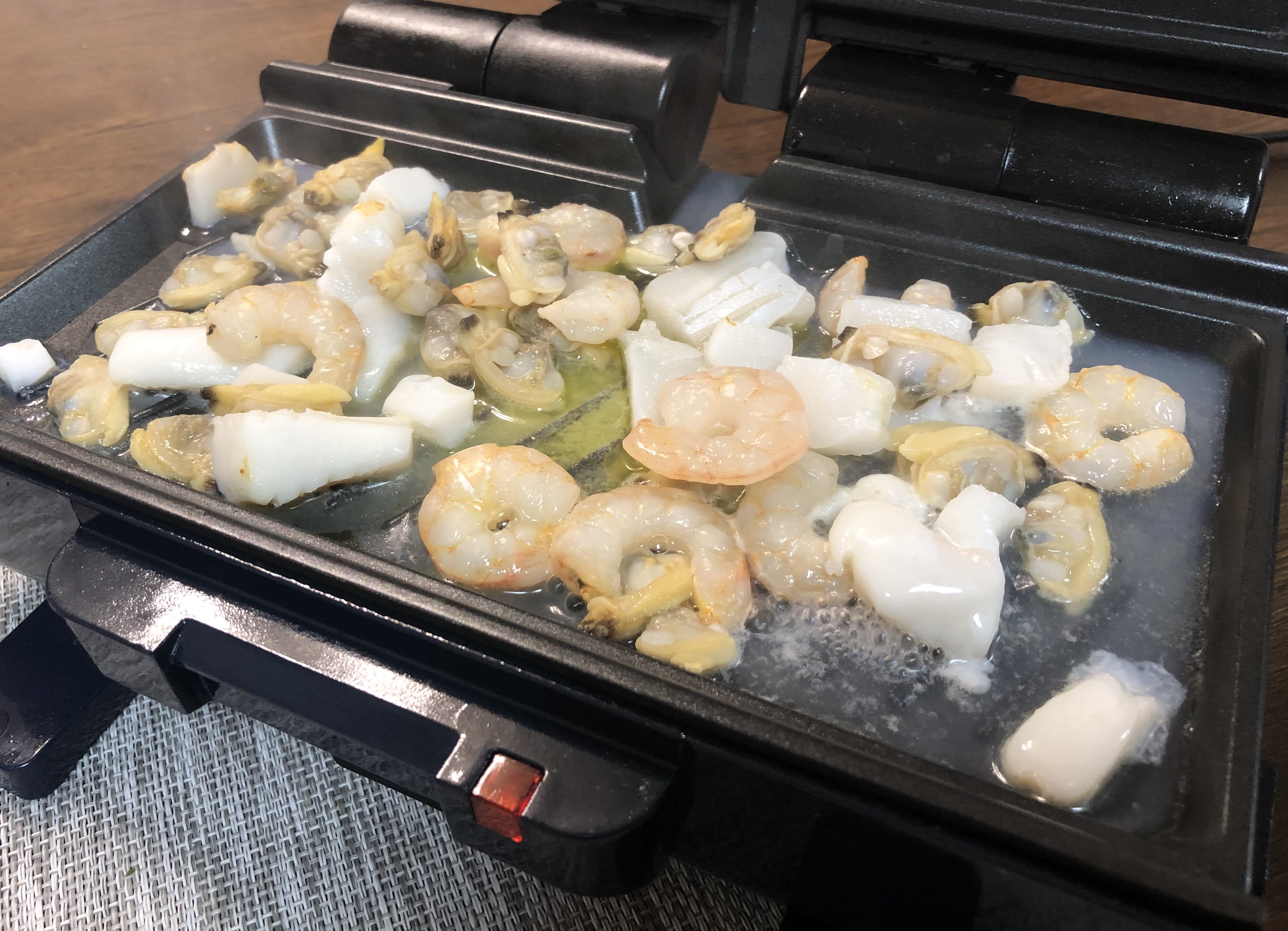▲冷凍シーフードをそのまま焼いてみたところ、当たり前ですが水分がたくさん出て大変なことに(水はすべて油受けに流れ落ちました)。味はおいしかったです