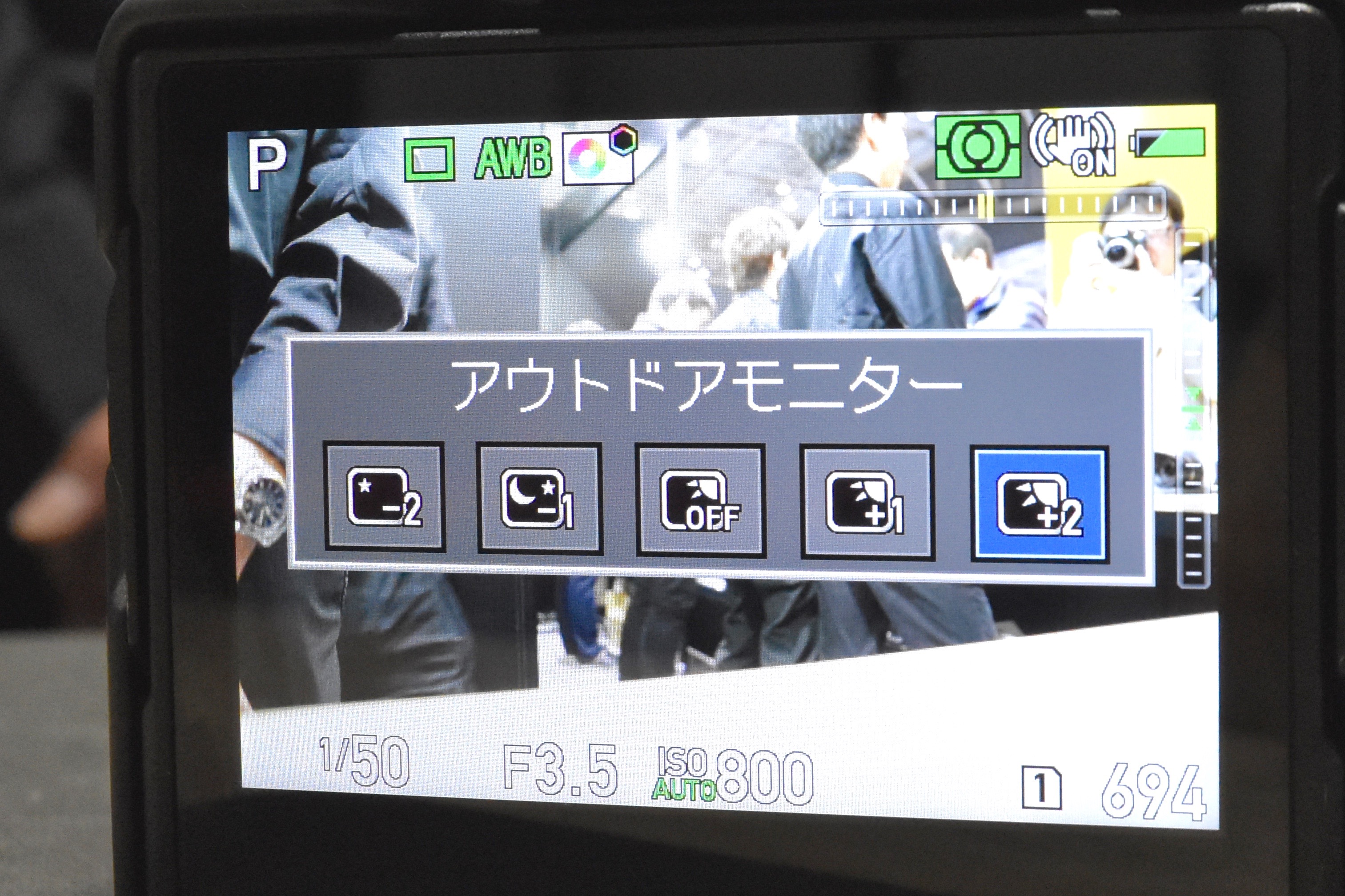 いちばん右の「+2」に設定するとモニターが非常に明るくなる。晴天のまぶしい雪山や海辺といったシーンに