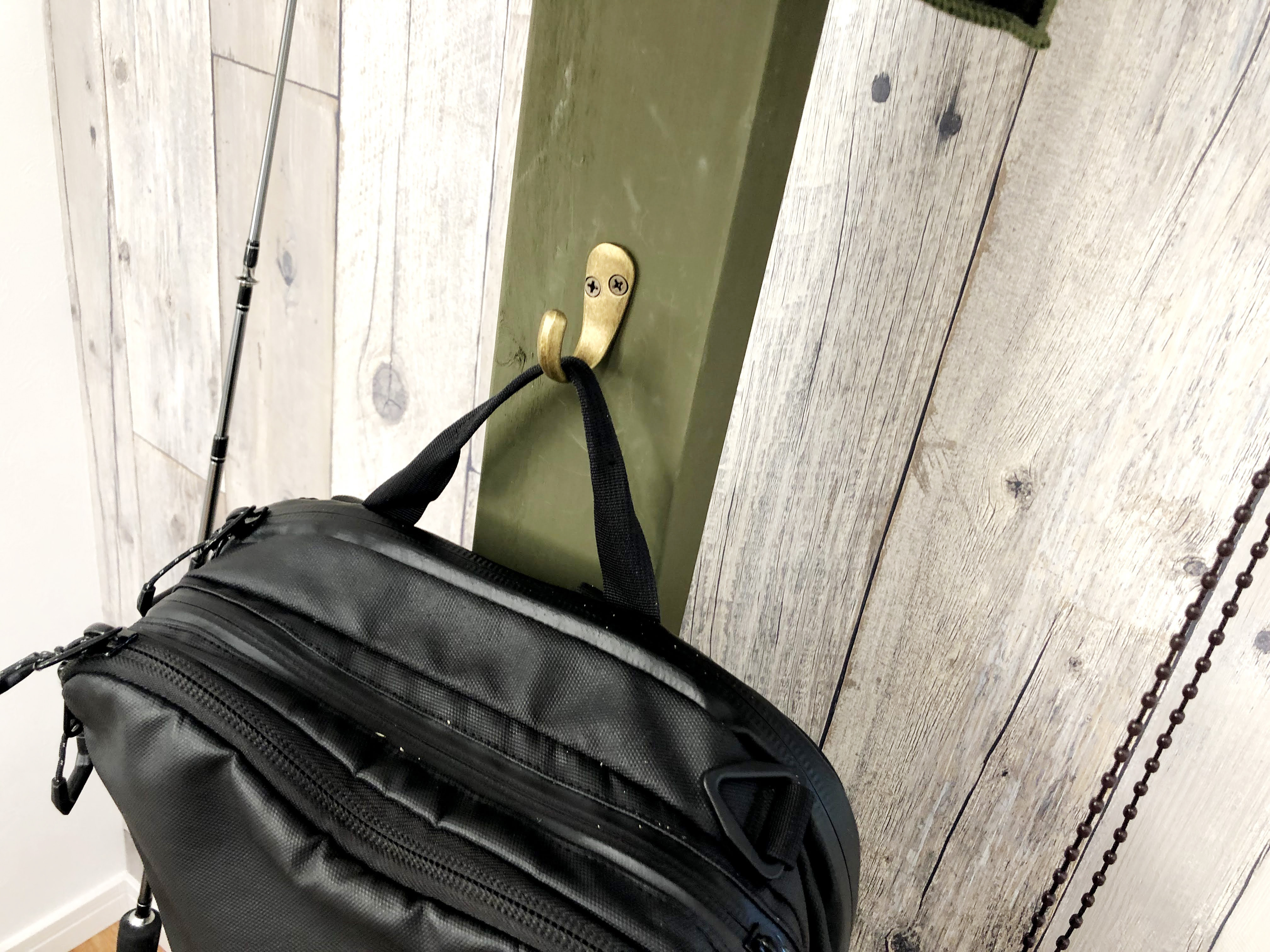 とまあ、このように飾り棚やフックをラブリコに設置すれば、好きなものを目立たせることができます。バックパックなんかを床に置くのも嫌だし、部屋の棚に収納すると出し入れが面倒など不満点が解消されました。