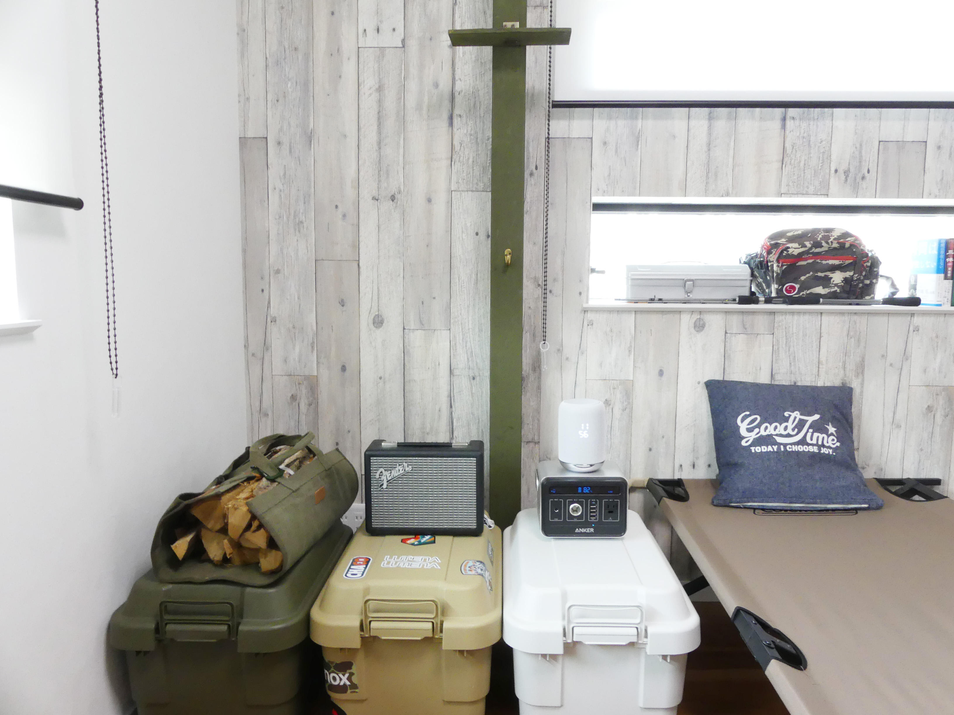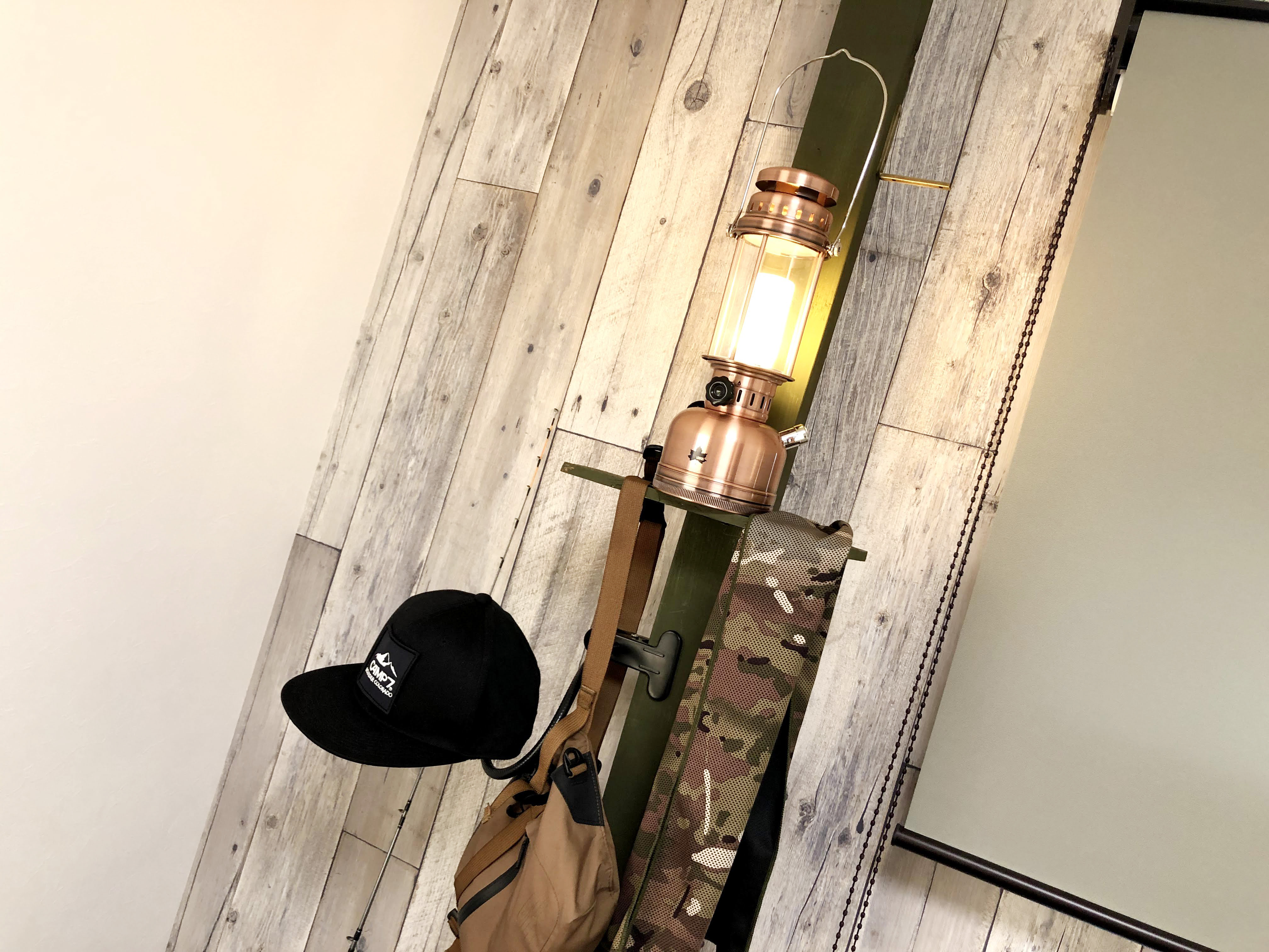 ▲ランタンと迷彩柄のタオルを引っ掛けたところ。う~ん、キャンプ感あるなあ