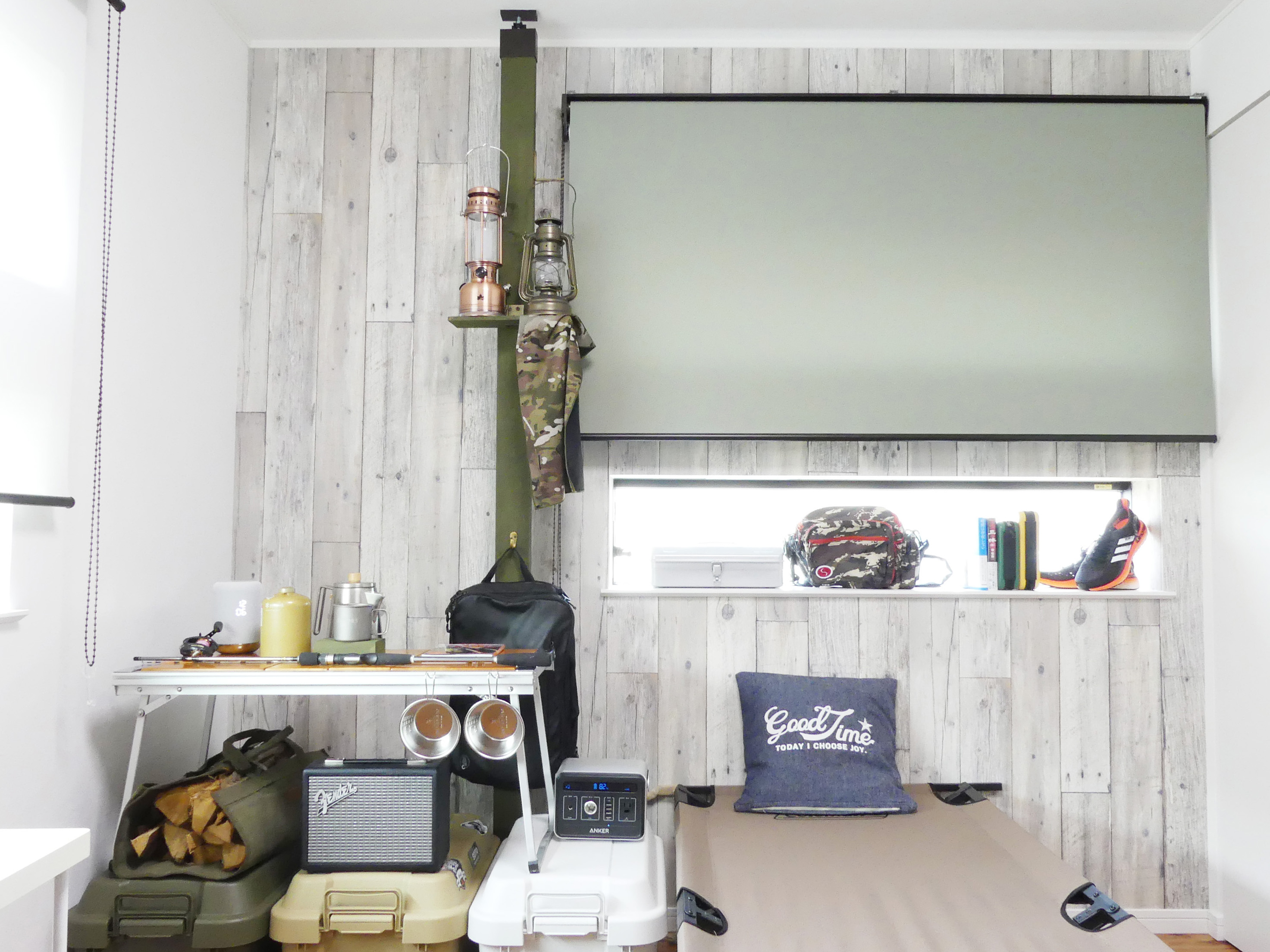 なにより仕事をしている最中に横を振り向けば、自分の愛用ギアたちが目に入るといううれしさ。コレに尽きます。軽く布なんかを垂らすとグッと雰囲気が出ますね。