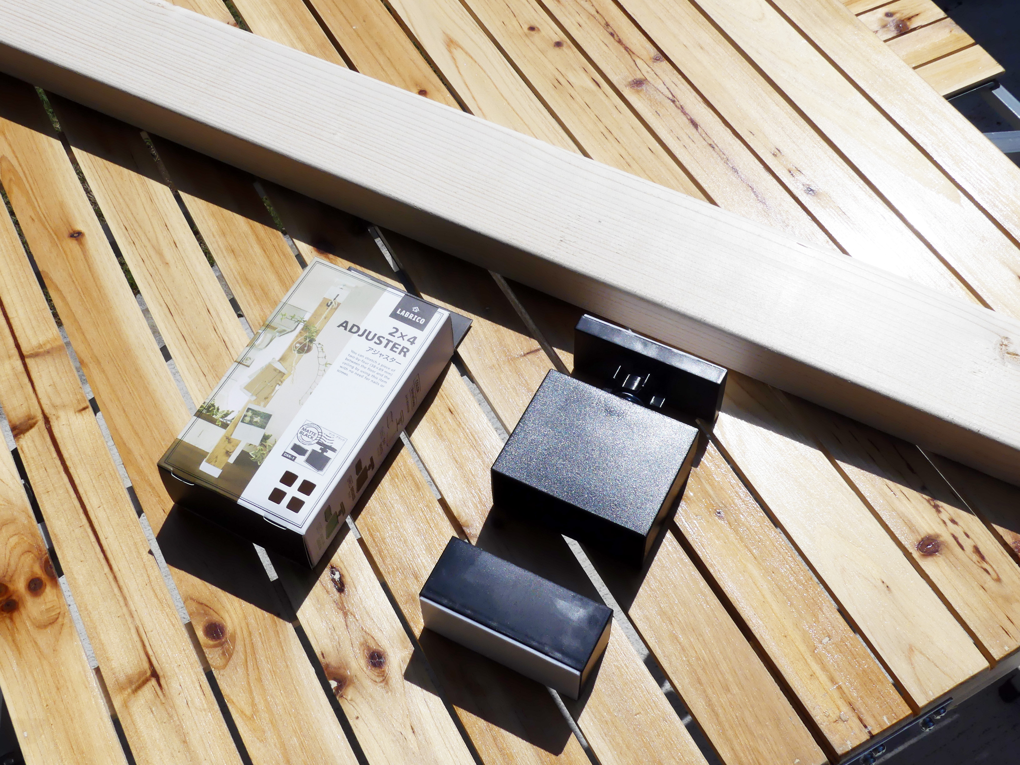 まず「ラブリコ」とは、基本となる木材の断面のサイズが約2インチ×4インチ(正確には38×89mm)であることから、「ツーバイフォー材」と呼ばれる木材にセットするDIY用のアイテム。手軽にホームセンターなどで入手でき、天井の高さ-35mmのツーバイフォー材を用意し、天地にセットすれば天井や壁を傷つけることなく柱として使うことができます。