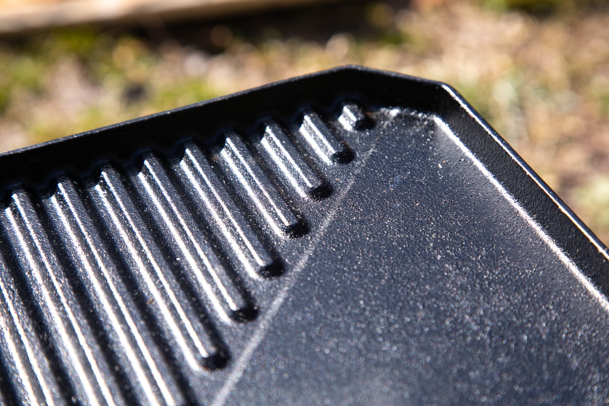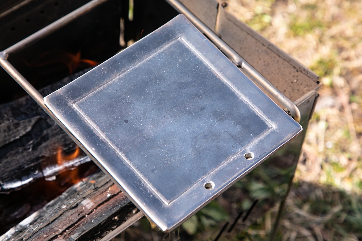 縁があるので脂が落ちず、ソースも受け止めます。サイズは同社の「ユニセラ」「薪グリル」にフィットするよう設計されています。