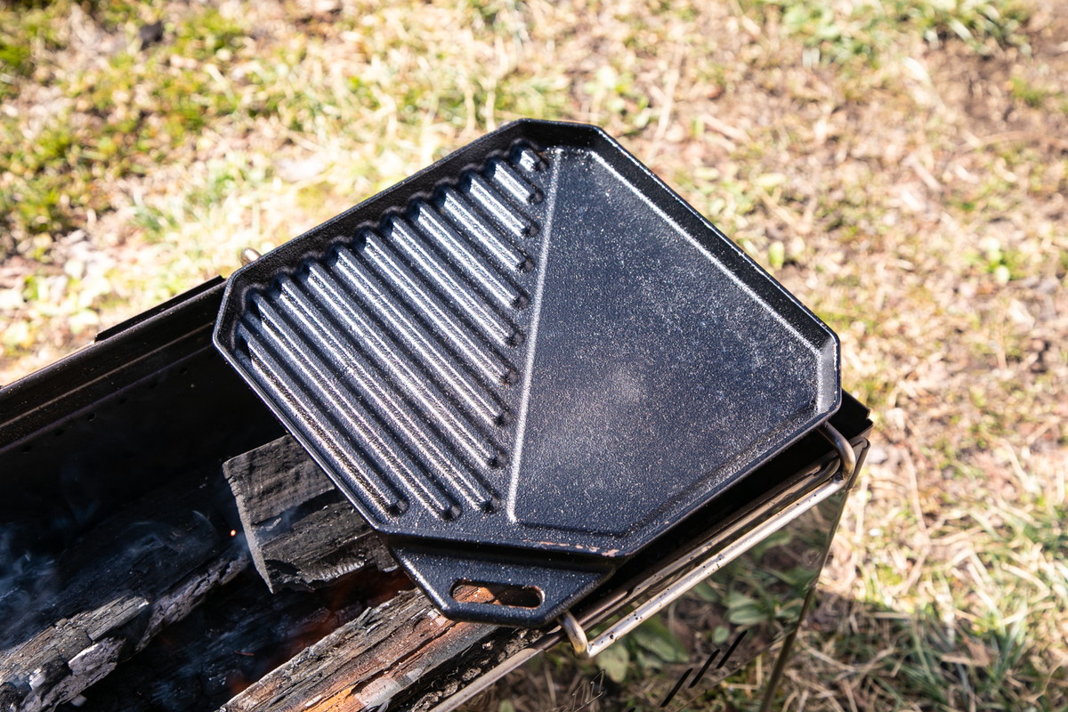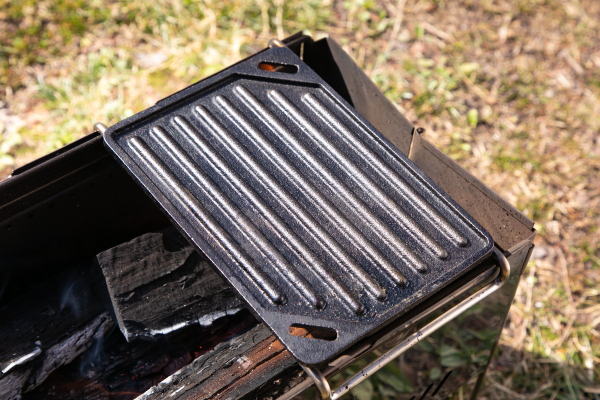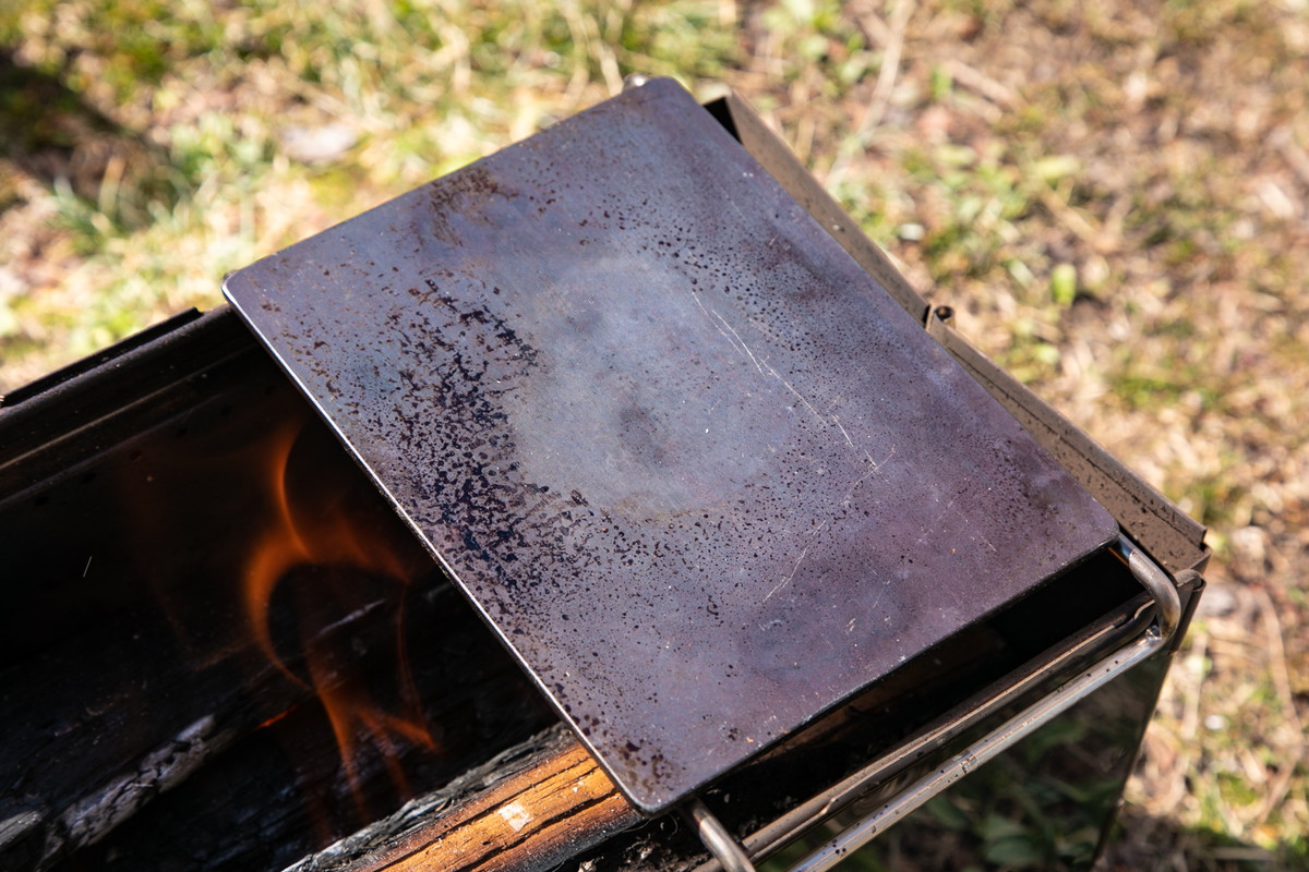 「フォールディングファイヤーピット」の奥行きは22cmで専用クッカースタンド(ゴトク)は長さ14cm。ベルモントの「極厚鉄板(ミニ)」以外は、ゴトクをすっぽり覆う大きさです。長辺20cm前後というのがひとつの目安となっているようです。