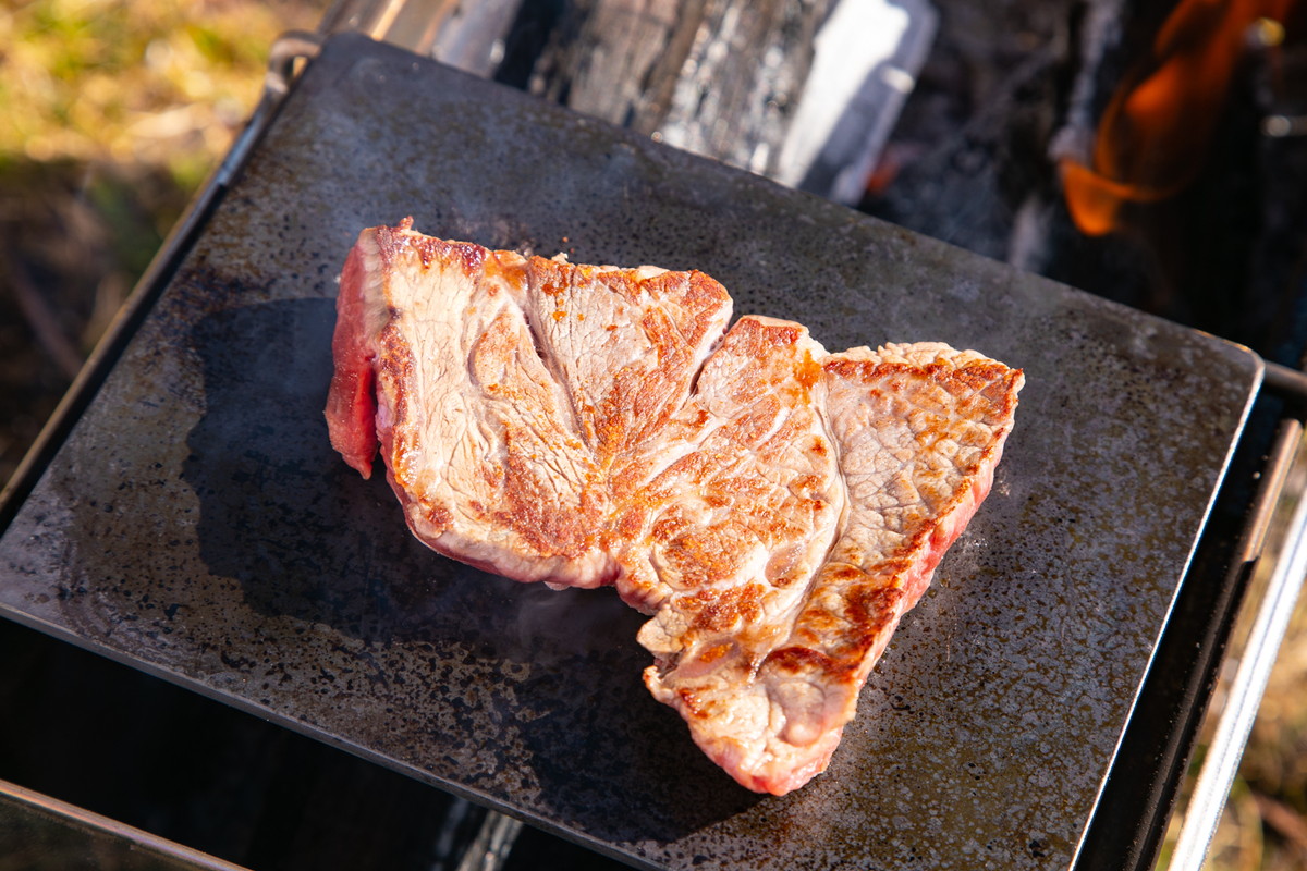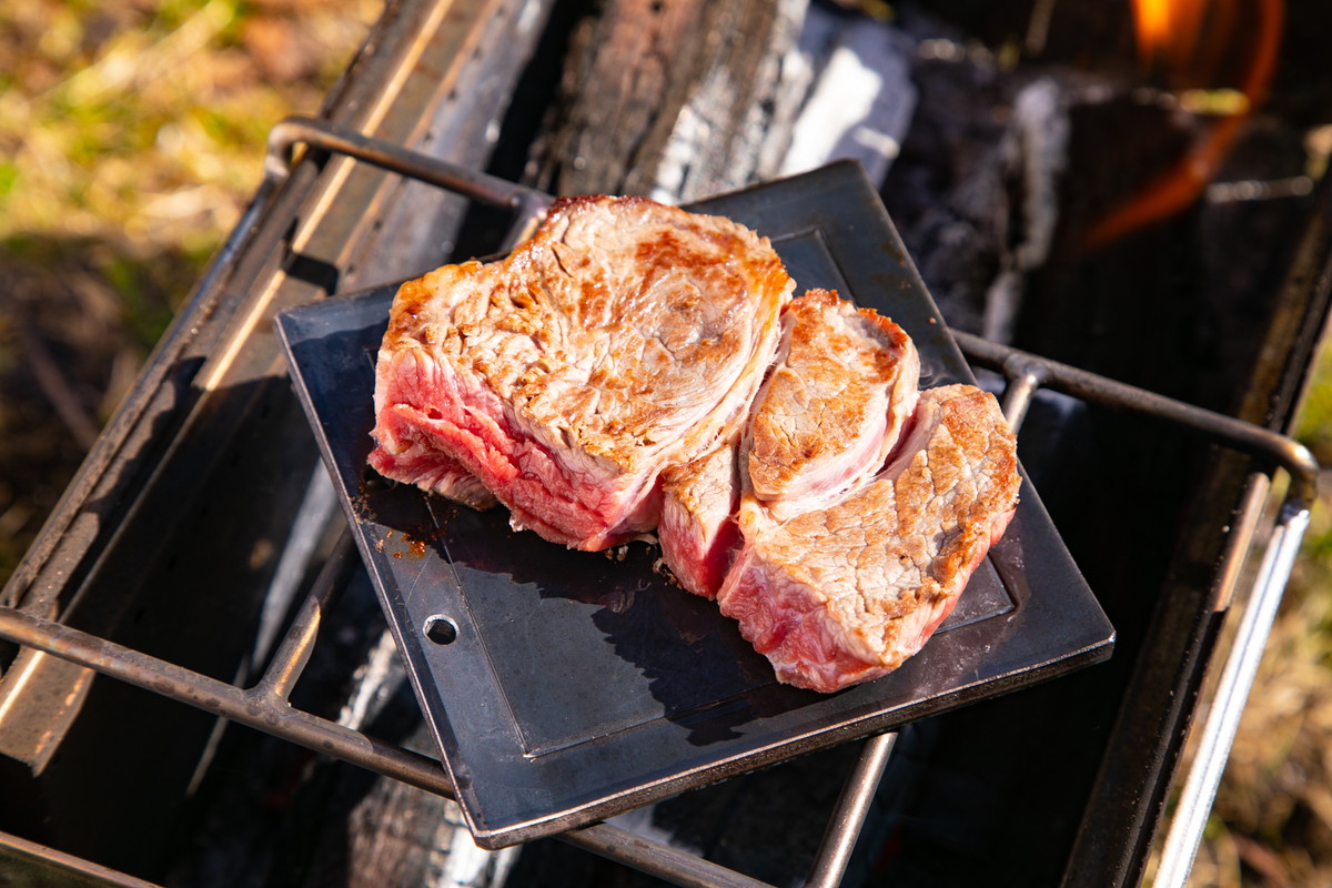 ちなみに長さ20cm程度の鉄板は小さく見えますが、ステーキ肉がぴったり乗ります。鉄板は一度熱くなると続けて焼き続けられるので、ソロはもちろん4〜5人利用にも対応します。