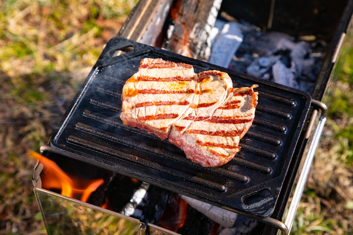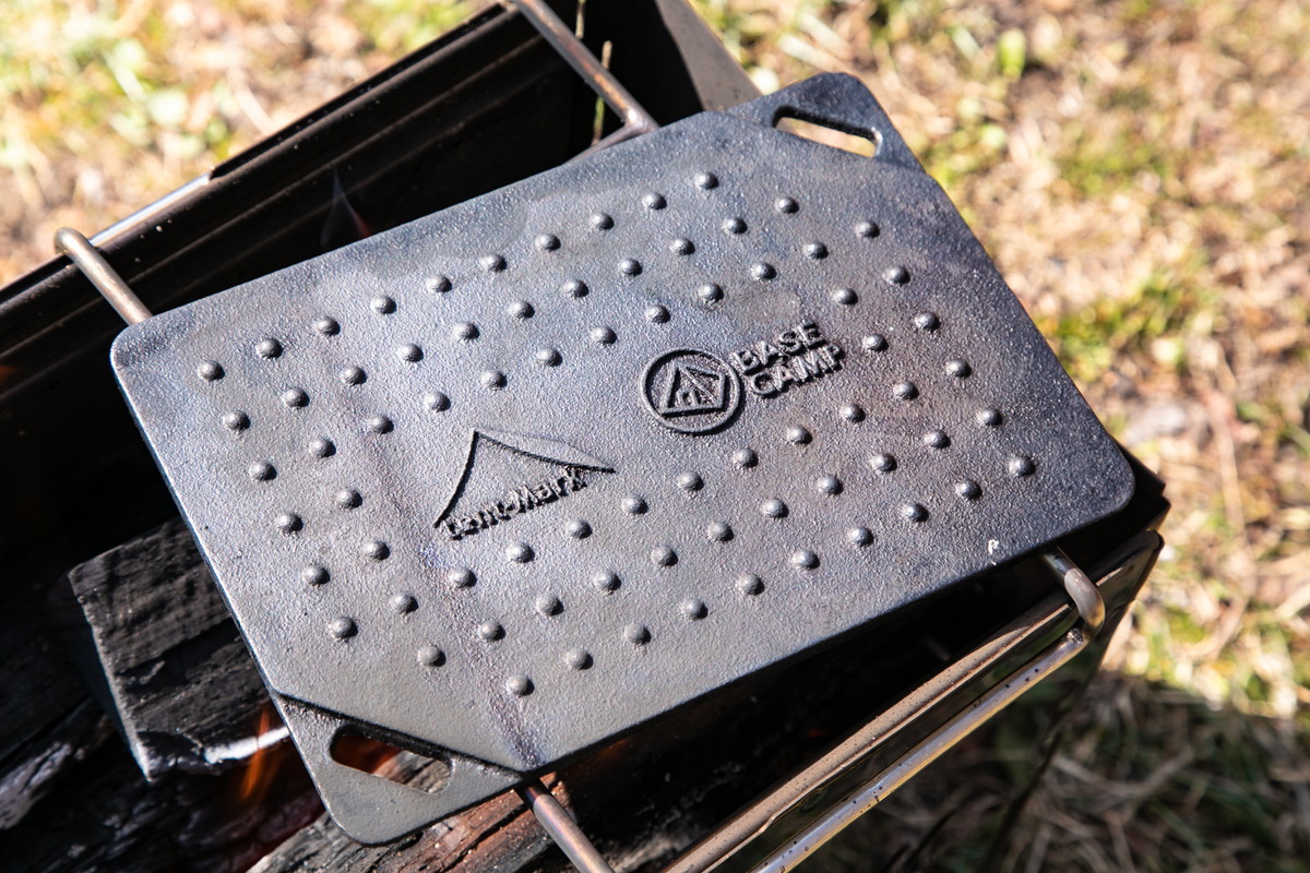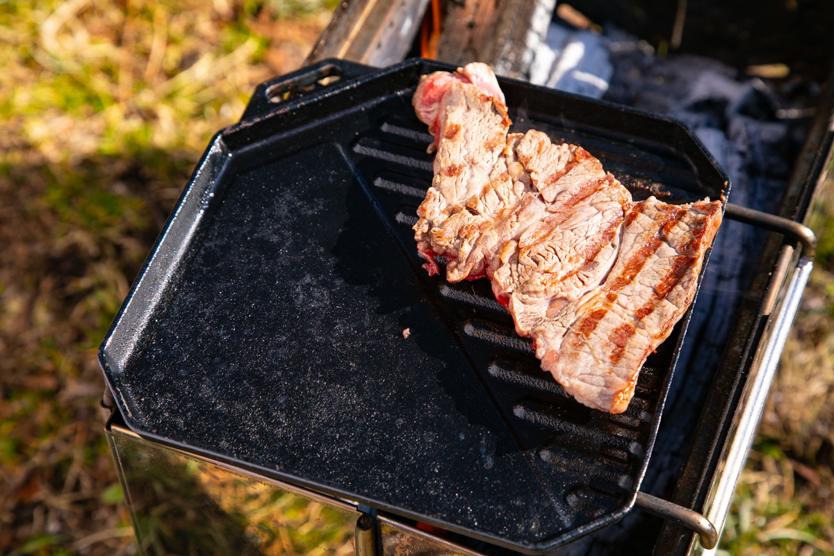 東京・水道橋のカフェ「BASE CAMP」店主であるA-sukeさんが、肉をおいしく焼くための鉄板として開発した「男前グリルプレート」。波型構造のためおいしそうな焼き色が付いています。脂は溝に落ち、そして下に流れ落ちることがないので、焚き火はもちろんガソリンバーナーなどにのせて調理するときも安心です。