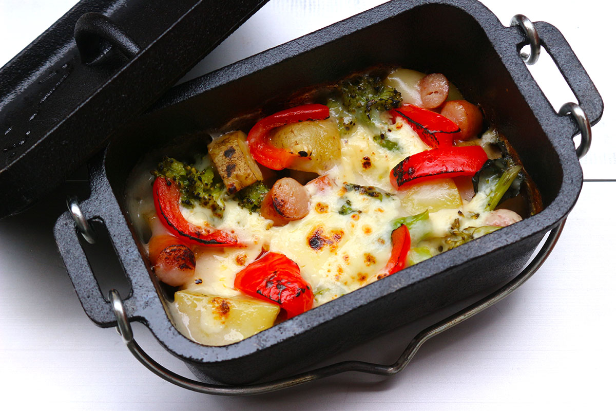 フタ裏には凹凸がついていて、ステーキ用の鉄板にぴったり。ダッチオーブンなので、フタの上に熾き火を載せて全方向から加熱できます。いわゆるオーブン料理にも使えるので、1〜2人分のグラタンやドリアなんかも作れちゃいます。小さくたって蓄熱性がよく、熱々が続きますよ!