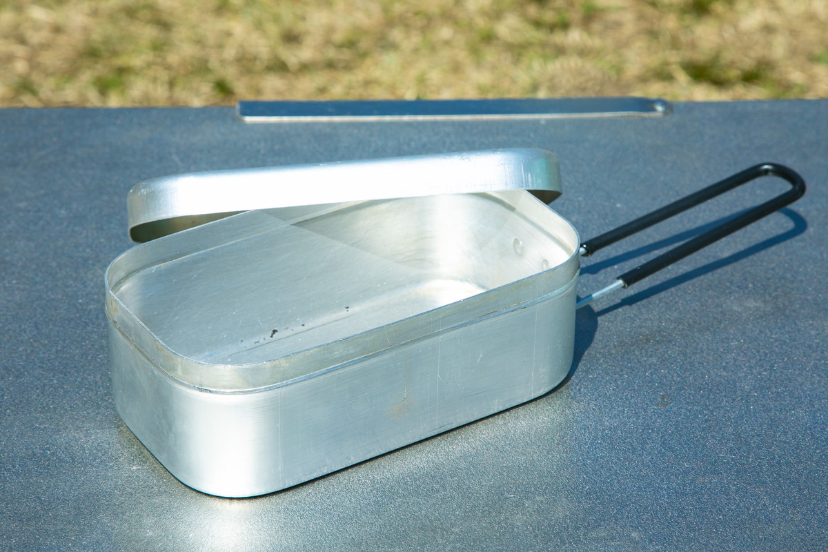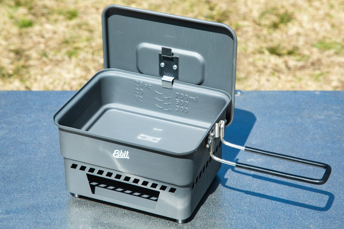 アルマイト加工されたアルミクッカーと、固形燃料用のゴトクのセットで、クッカーの中にすべてを収納できます。それにしても、ふたをクッカーの端に引っかけておけるのが秀逸。