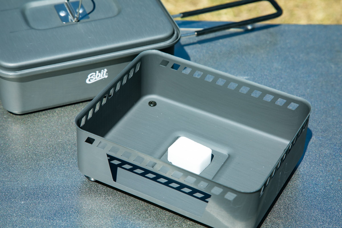 ゴトク内は中央に凹みがあり、ここに固形燃料をのせます。エスビットの固形燃料用ストーブ「ポケットストーブ」は2方向からの風を防ぎますが、残りの2方向は風の影響を受けやすいという特性がありました。でもこの「クックセット」のゴトクであれば三方向の風を防ぐし、熱を逃がしません。