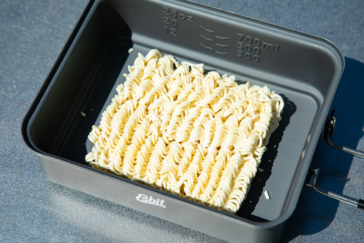 クッカーの容量は1100ml。ごはんは2合分まで炊けます。インスタントラーメン1袋作ってみましたが、具なしならギリギリ2杯いけるかも。