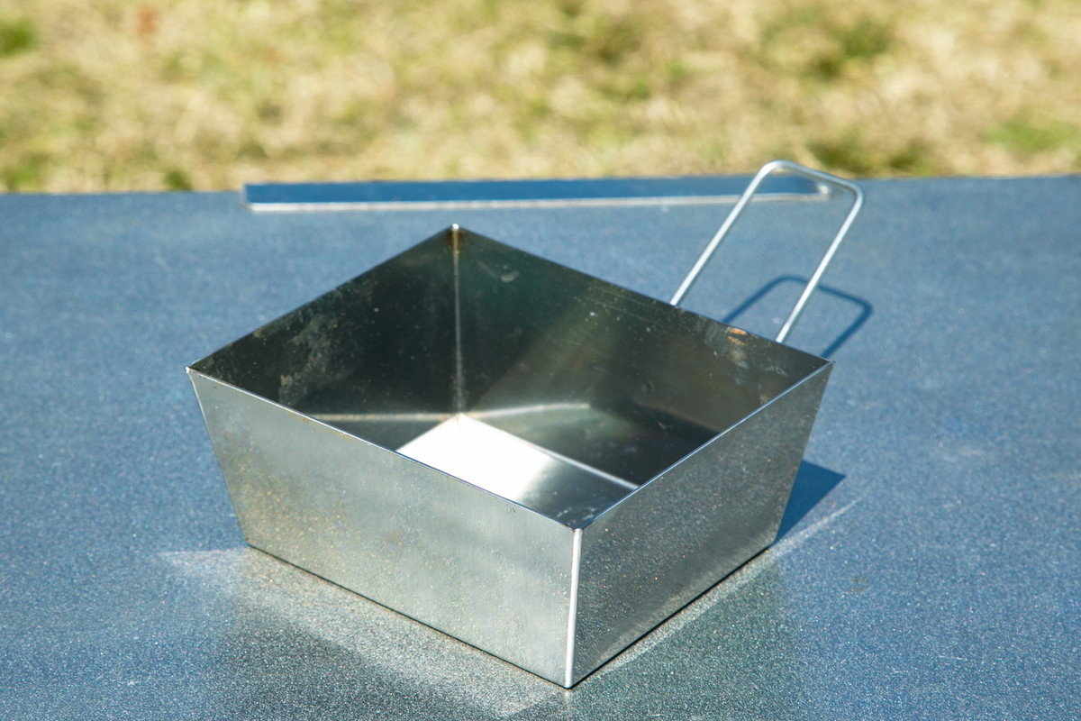 角形クッカー人気の火付け役。無加工のアルミ製で、とにかく軽い! バーナーのゴトクからはみ出てしまっても、アルミ製なので熱熱伝導率が高く、思いのほかムラがありません。アルコールバーナーのようなじんわりとした火でおいしくご飯を炊けます。