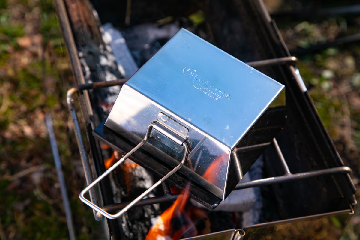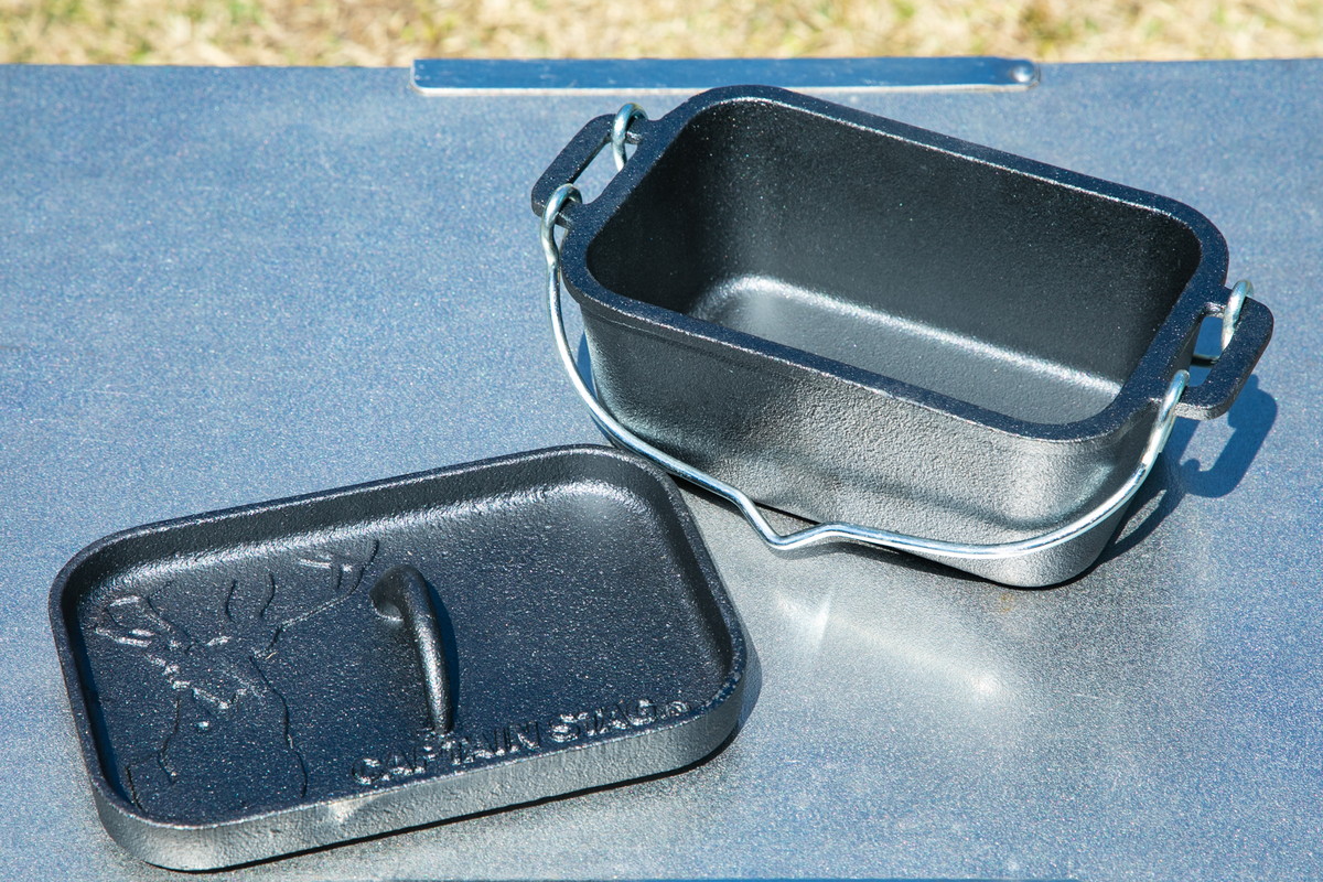 焚き火料理に重宝する鉄鍋。キャプテンスタッグからは、ソロキャンで人気の「カマド スマートグリルB6型」にちょうどいいちっちゃな角形ダッチオーブンが登場しました。