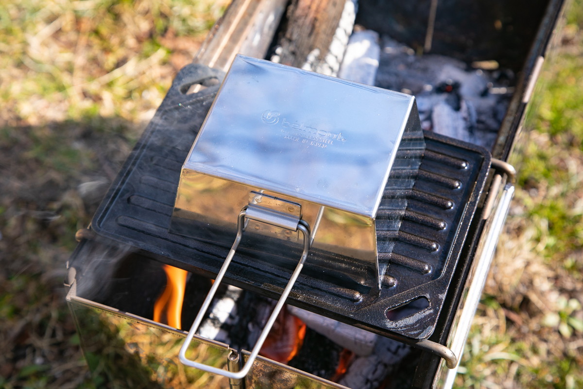 ハンドルの向きを上下付け替えると、同じくベルモントの「極厚鉄板(ミニ)」をすっぽり覆えます。しっかり覆ってくれるので風で表面が乾いたり、芯まで火が通りにくいなんてことを防いでくれるんです。もう、大好きなステーキ、餃子で失敗しません。