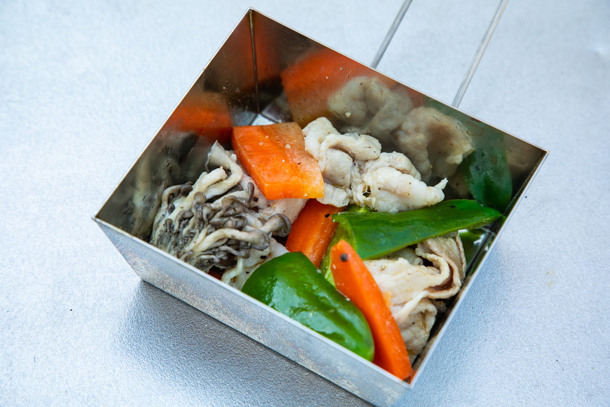 鍋にしてサッと野菜を炒めてみました。小さいけれど深いので、具がこぼれることもありません。具だくさんスープや煮物もしやすそう。底が小さいのでバーナーの火からはずれにくいのもいいですね。
