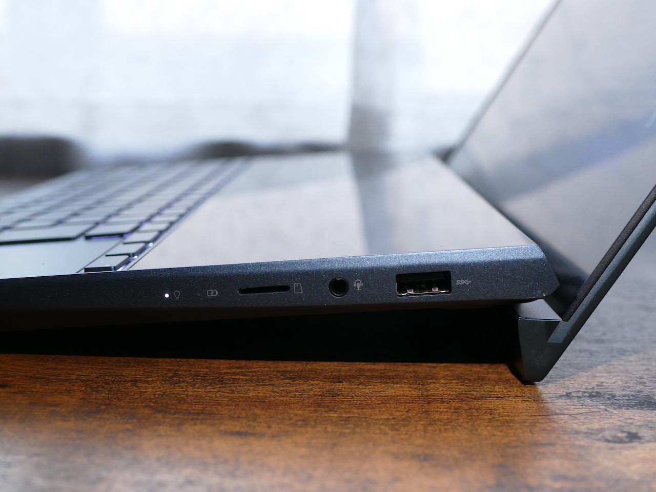 ▲画面を開くと、エルゴリフトヒンジによって5.5度の傾斜がつく。右側面のインターフェースは、右から順にUSB 3.0、マイクロホン/ヘッドホン端子用ポート、microSDカードスロット