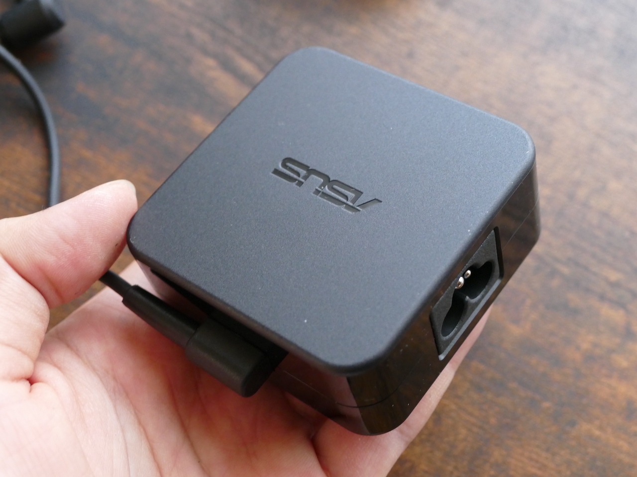 ちなみに、同梱の充電器はやや大きめ。筆者の手の平くらいありました。