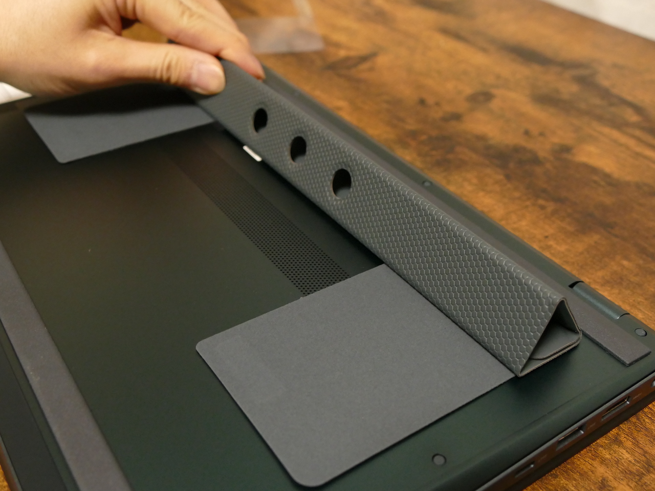 なお、標準の持ち上がる角度で足りない場合には、同梱されているスタンドを活用することで、より端末の角度を持ち上げることも可能。