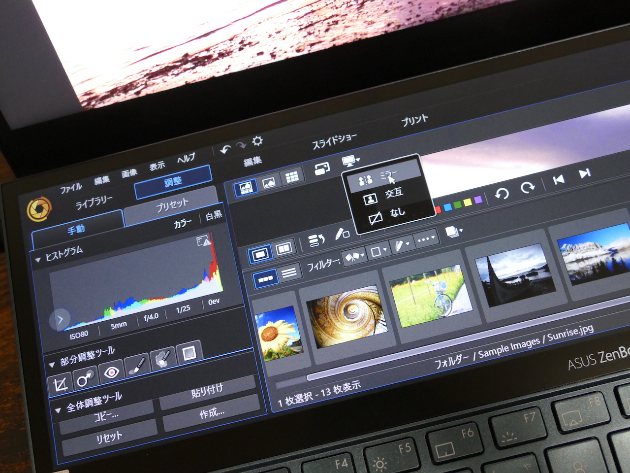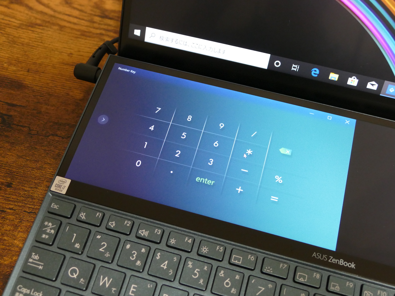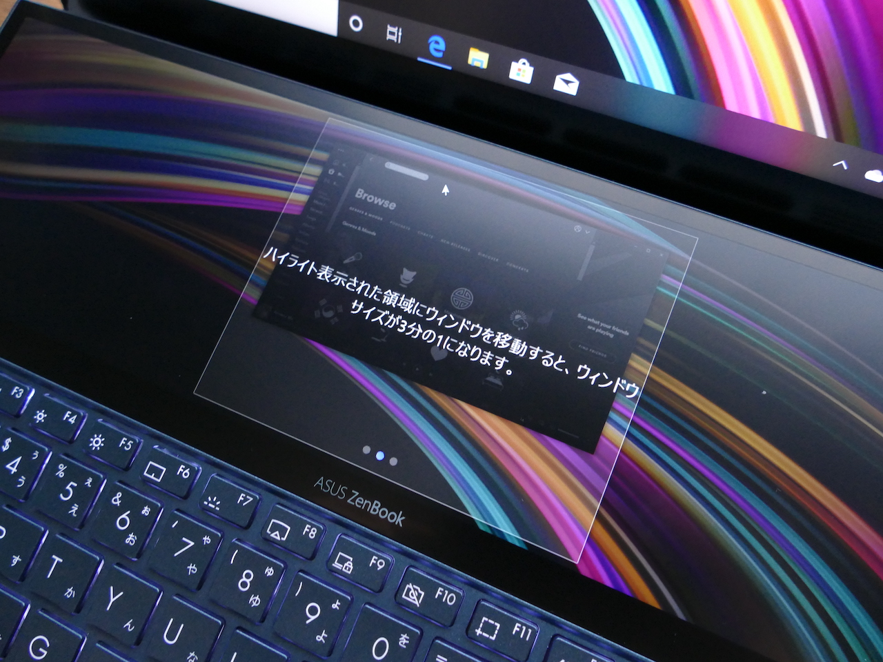 ZenBook Duo最大の特徴は、ZenBook Pro Duoと同じく「Screen Pad+」というセカンドディスプレイを搭載したことです。表面はノングレアで解像度は1920x515ドットのフルHD相当。