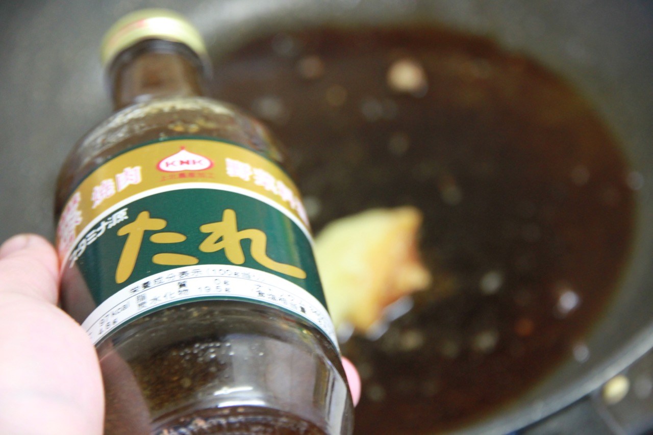 さらにタマネギやリンゴも入れるとコクが出ますが、ちょっと手間なので、この世のものが大体全部入っている調味料「焼肉のタレ」を少々。