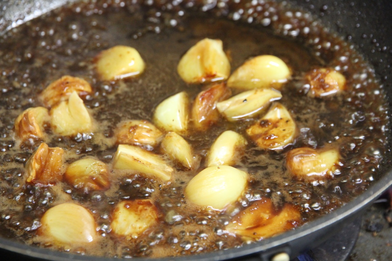 ゴロゴロニンニクは、タレと一緒にひと沸かしします。最後にお肉をお箸で食べられるように切り分けて、タレを絡めれば完成!