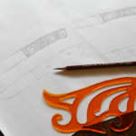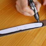 発注して数日、我が家にナイフ材料がやってきました。いよいよ工作開始。まずは届いた鋼材に私がデザインしたナイフの型を貼り付けてサインペンでラインを引きました。
