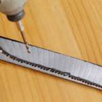 次にステンレス用のドリルをつけたインパクトドライバで、サインペンのラインに沿って穴を開けていきます。この時に気をつけなければならないのが、穴を開ける位置。サインペンのラインより内側はナイフになる部分ですので、その部分に穴を開けてしまうとナイフが小さくなってしまうのです。