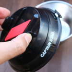 キャプテンスタッグの「シェラカップスプーン」(750円/税別)といっしょに持ち運べます。キャプテンスタッグのシェラカップには50mlと90mlごとに刻みが入っていて計量カップ代わりになるし、シェラカップスプーンのくぼみは小さじと同容量。アウトドアキッチンにまとめて吊しておくと、何かと重宝するセットになるんです。とくに目分量が苦手な料理初心者は手放せなくなりそう。