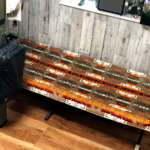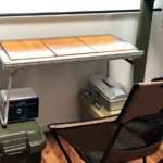 続いてキャンプでも使っているローテーブル。プラモデルなどを作る作業台として普段は活用していますが、なんかこう足元が見えていてカッコよくはない。ということで、ここにもペンドルトンをふわっと被せてみると…。