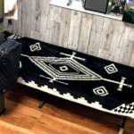 エイヤッと前述のホワイトとブラックなブランケットをかけてみました。あ~、うん、なんか…違うかな…。何でもかんでも被せればいいというわけではない模様。その模様が原因なのか、どう見ても呪いの儀式に使われる椅子みたいになってしまった。柄とサイズ感が合わないと、失敗するのか…。やはりアウトドア系のファニチャーなら相性がいいので、いろいろと試してみましょう。