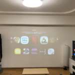 まずは初代モデルの「ポップイン アラジン」から見ていこう。筆者の自宅は壁が白くてすべすべになっており、スクリーンを設置しなくても十分にそのまま投写できるようになっている。部屋によっては投写したい場所にクローゼットやふすまがかぶるため、リビングだけはそのような状態でラッキーだった。