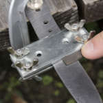 ここのラインが裏表対称で同じ位置にないと非常にカッコ悪いのです。ナイフDIY愛好家向け専門の「Matrix-AIDA」のサイトをのぞくと、この部分を研磨する際の専用ガイドが販売されていましたが、最近は金属DIYに熱心な私、ステンレスの板とボルトを使って見よう見まねで自作のガイドを作ってみました。ただし精度はイマイチで、微妙に裏表でラインがずれます。まあ仕方がないですね。