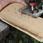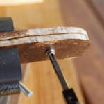 この板をジグソーでハンドルの形状に切り出し、先ほどとは別の専用接着剤で本体に接着。ファスニングボルトと呼ばれる部品でしっかりと固定します。このボルトは柔らかい金属でできているので、このままヤスリでハンドルと一緒に削れるのです。