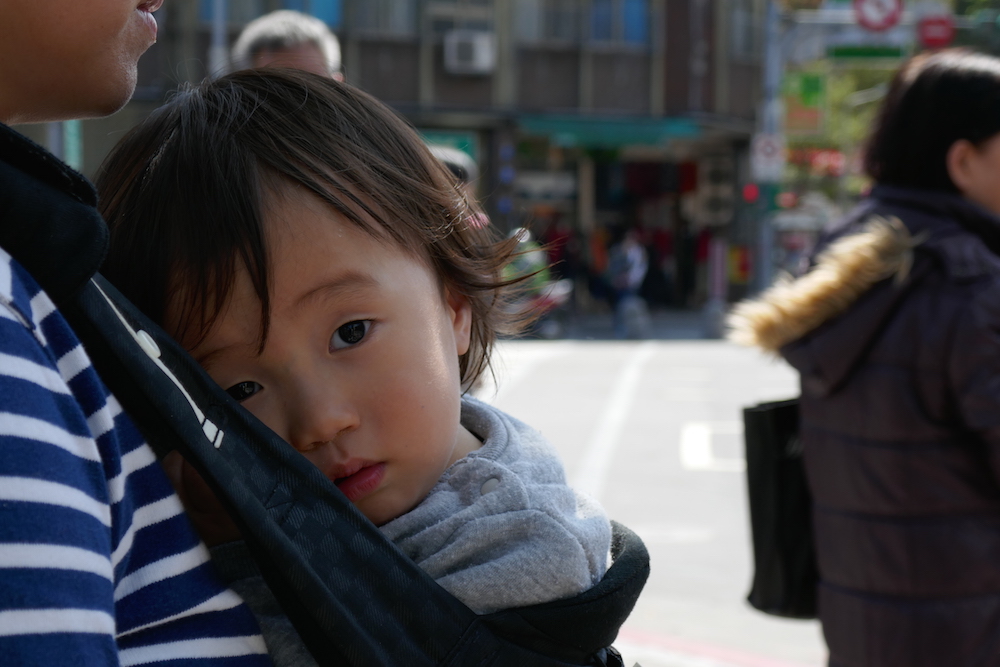 「阜杭豆漿」の店に着いた時には、既に長い行列が。子どもをあやしつつ、写真を撮りつつ、店に入れたのが30分後だった(TX1)
