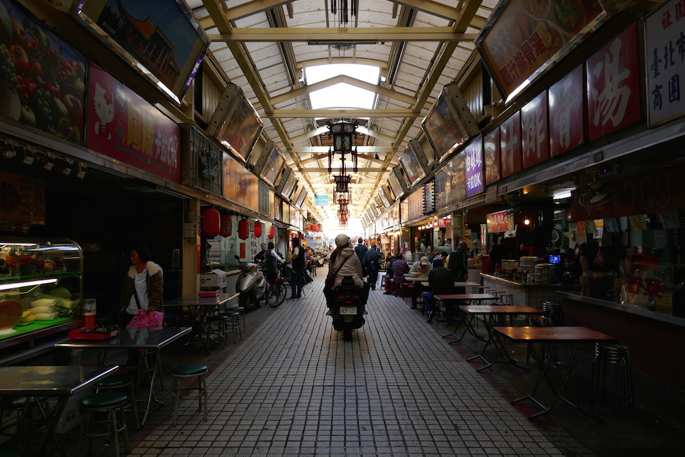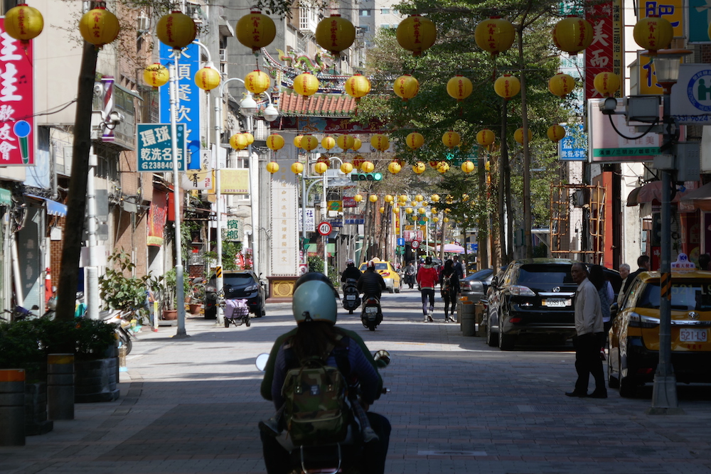 ずんずんと歩いていくと、提灯がキレイに掛けられた通りへ。台北は、油断すると外国に来ている感じがしなくなるのだけど、ここは“台湾らしい”風情(TX1)