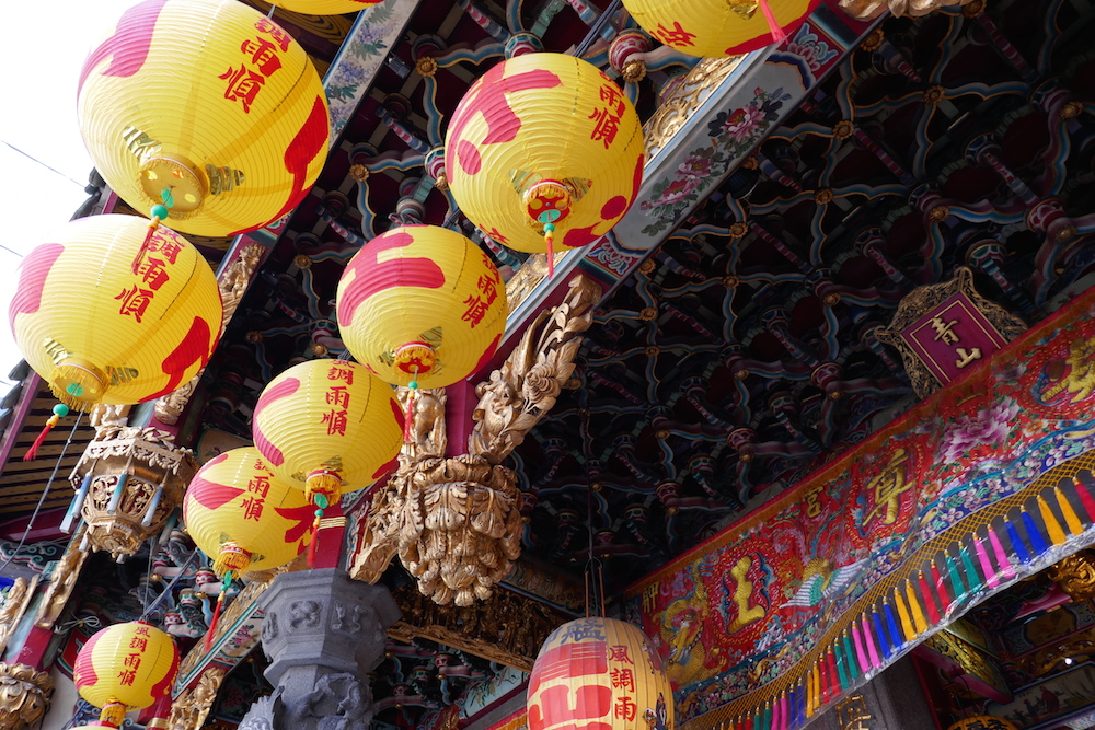 通りの途中に突然あった、艋舺青山宮。どうやら通りの提灯は、この寺と関係があるらしい。ちなみに「風調雨順」とは、物事がすべて上手く運ぶようにという願いが込められた言葉……らしい(TX1)