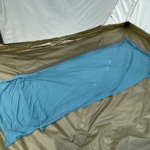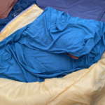 実際に「SCボックスシーツ」に潜り込んでみました。夜の気温が20℃程度だったので、寝袋を使わず、これ1枚でちょうどいい感じです。