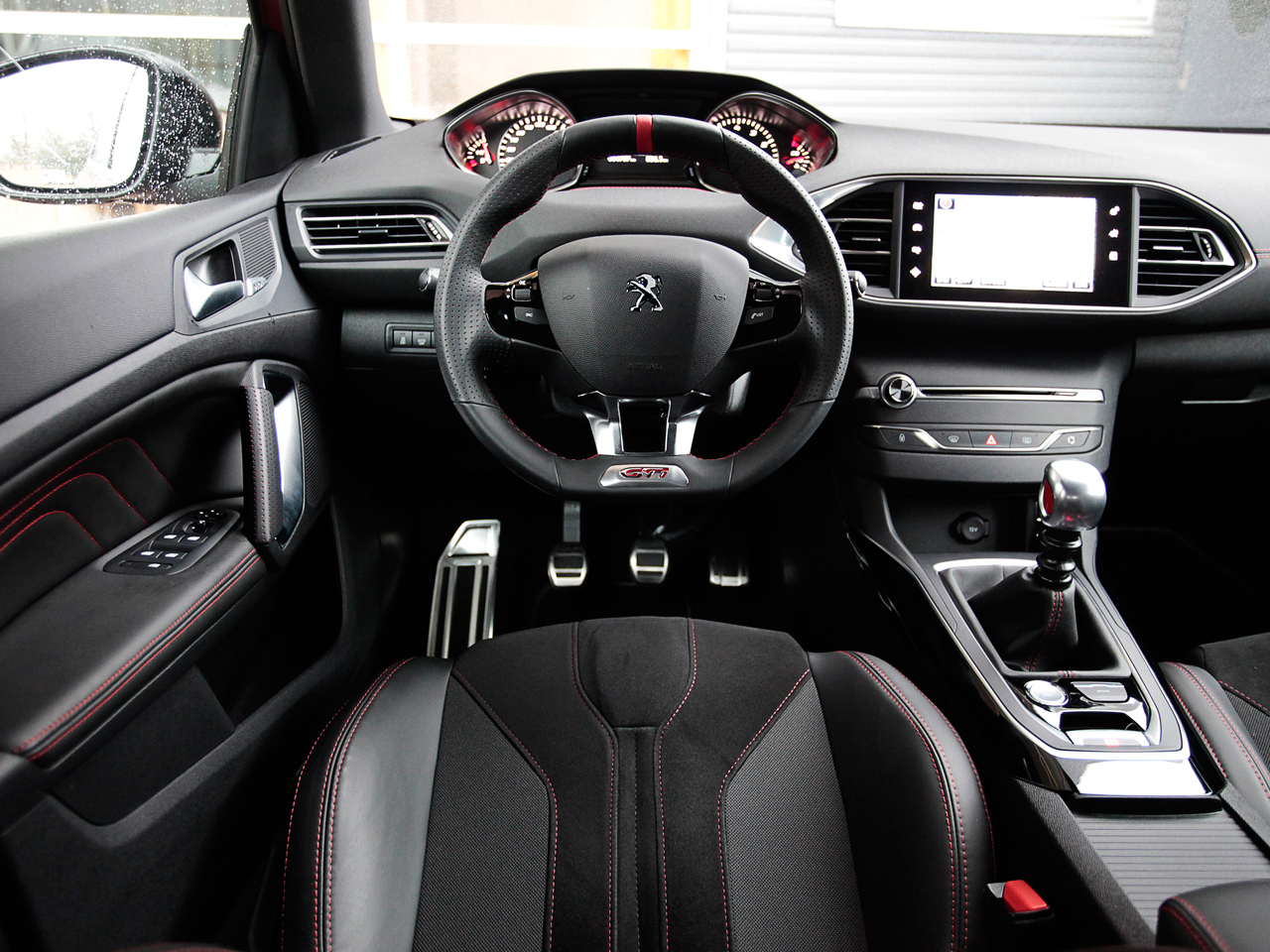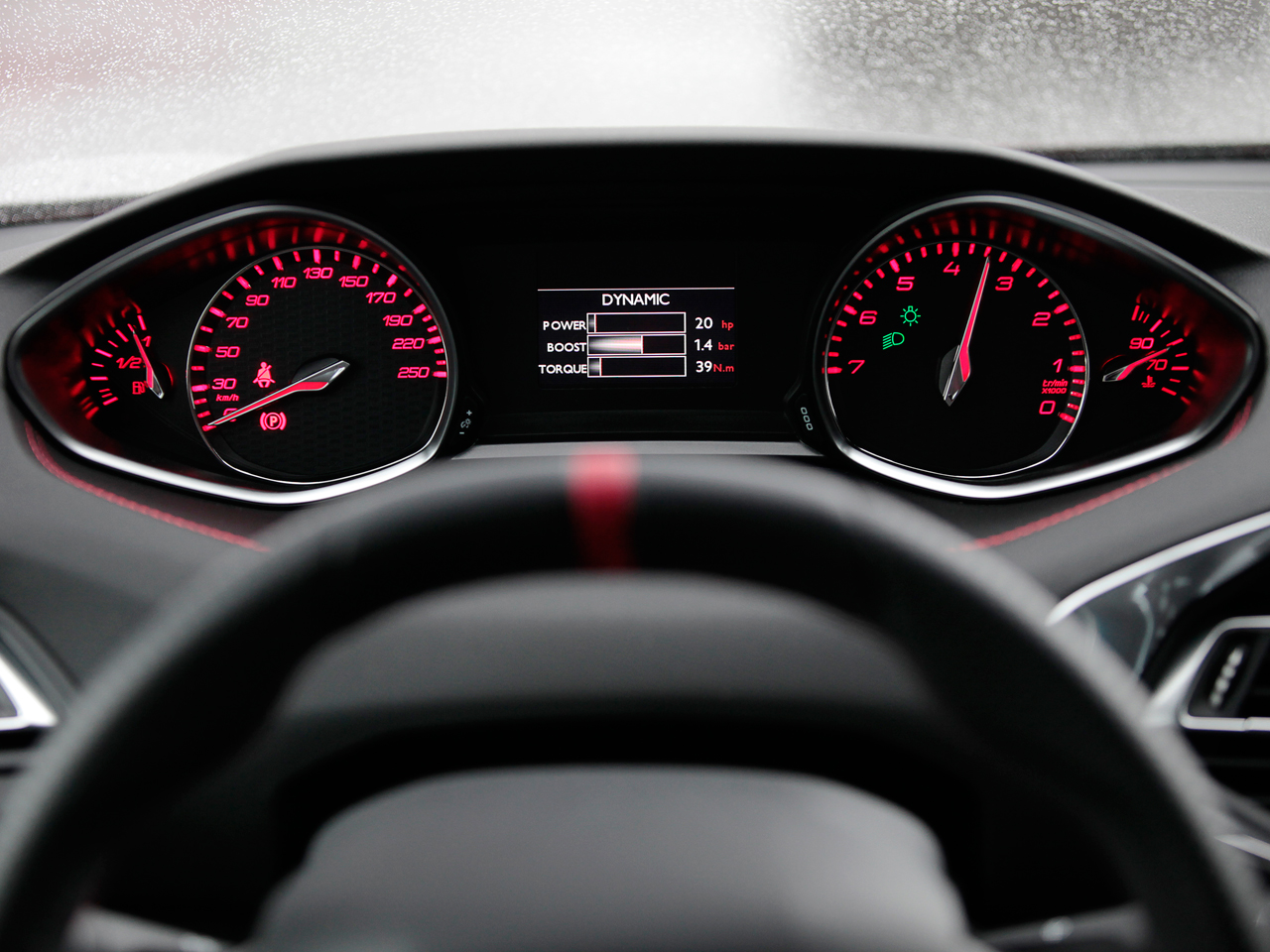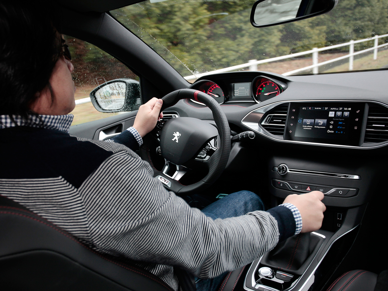 さて、話を戻しましょう。308GTiに装着されるステアリングホイールは、楕円の小径タイプ。ステアリング位置は低めで、高めのダッシュボードとの相乗効果で、(気分的には)なんとなく、腹の前にハンドルがあるような、プジョー独特のポジションとなります。