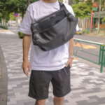 ▲168cm、中肉中背。このぐらいのサイズのボディバッグなら、背中側で持つのが個人的にはベストポジション