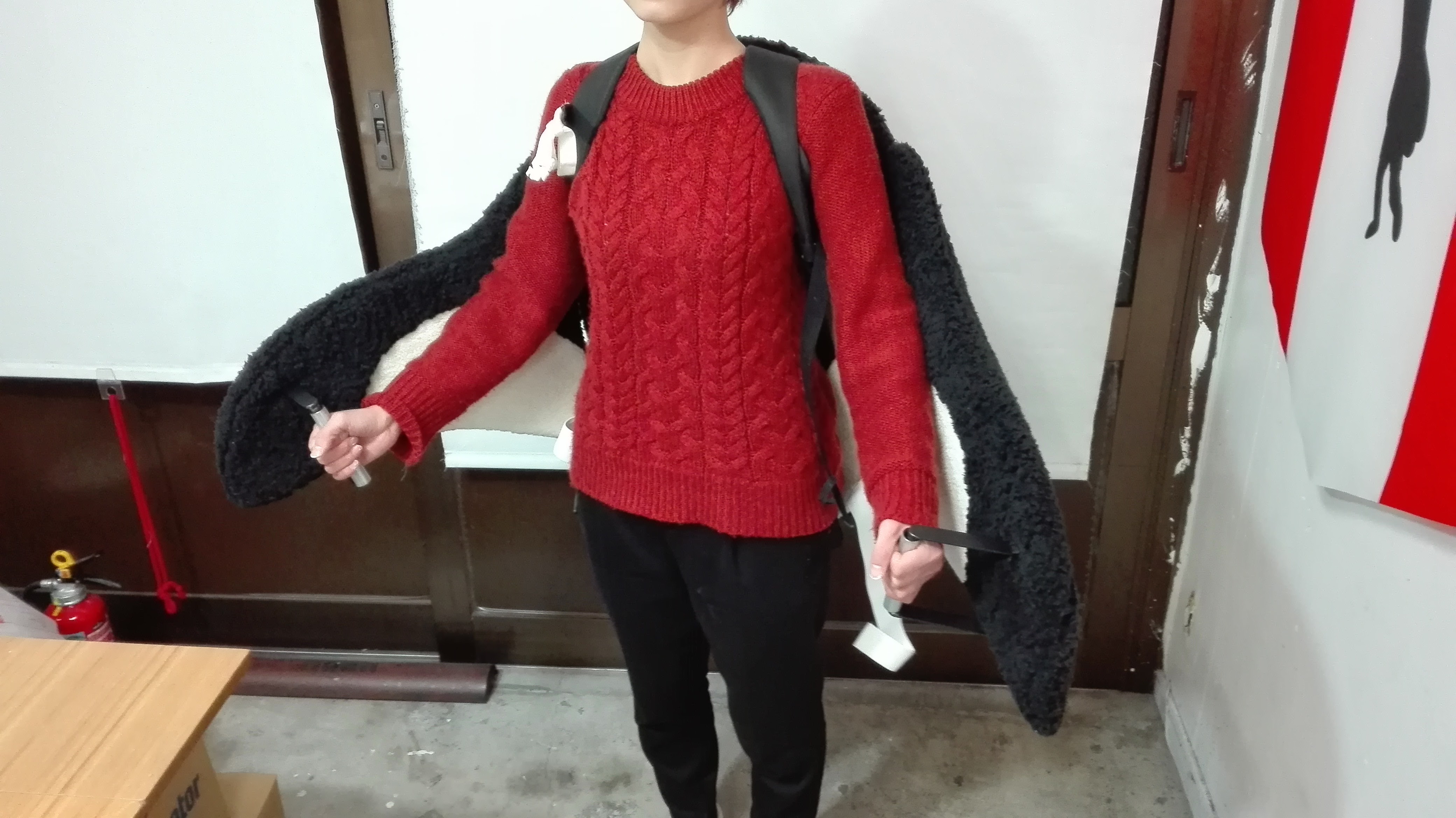 面白いのが、こんなふうにペンギンの翼のようなものを背負うところです。ジャイロならびに加速度センサーで羽ばたく動きを取得し、ペンギン側に反映されます。この企画は大学生チームのTRYROBOTSによるペンギンロボットぼ研究「もるペン!」をリクルートテクノロジーズが支援する形で実現した企画だそうです。